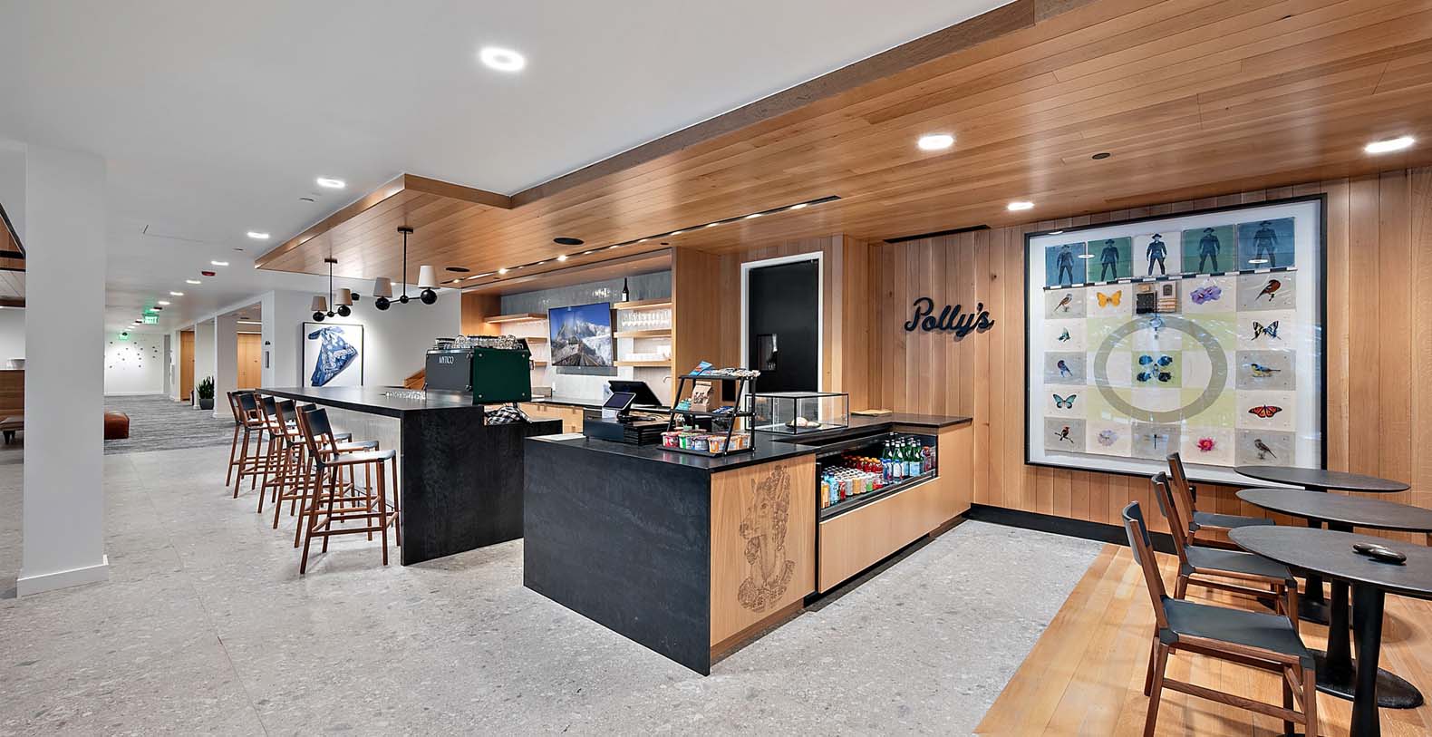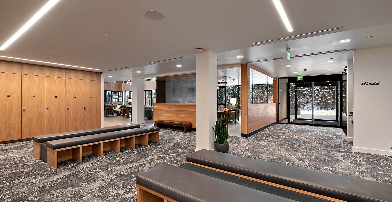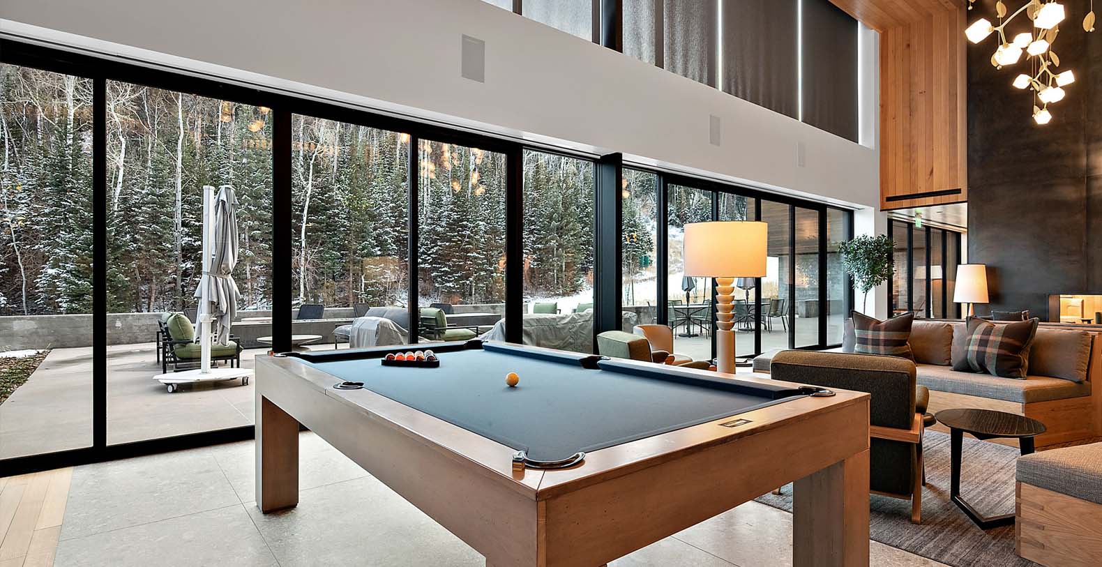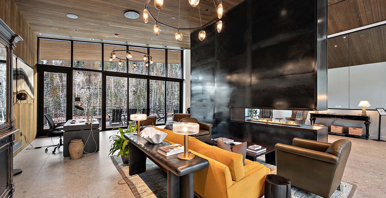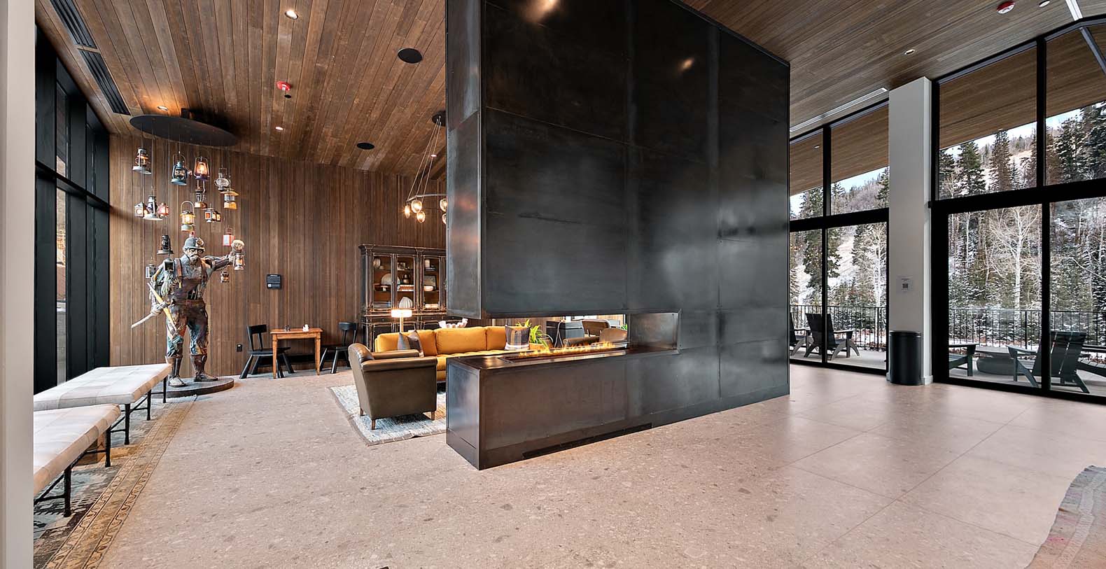 This stunning single-story condo showcases a blend of dark wood and stone, featuring a flowing floor plan that creates a seamless space for gathering. In the living area, floor-to-ceiling windows bathe the elegant furnishings and plank floors in golden sunlight. The gourmet kitchen boasts custom cabinetry and premium appliances, including a wine cooler, fostering a warm atmosphere ideal for cozy culinary evenings and cocktails at the 4-stool bar. A dining table positioned before a picture window invites 8 guests to relish meals amidst the surrounding natural beauty. After dining, sink into the plush comfort of the generous curved sectional and 2 barrel chairs, perfect for watching TV or enjoying the warmth of the steam fireplace. The expansive balcony extends from the living area, ideal for morning yoga during warmer months. The primary bedroom and guest bedroom both offer lavish king beds and private bathrooms; the primary bedroom also features a spacious balcony for refreshing morning air. Perfect for small families, the well-appointed bunk room includes a full-over-king bunk bed and a private bathroom. A convenient laundry room rounds out this exceptional condo.