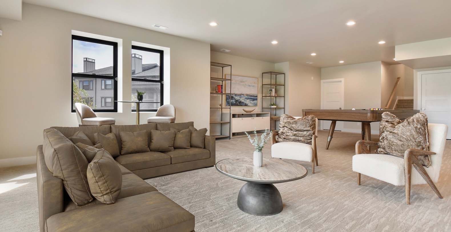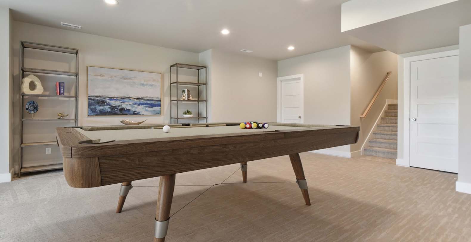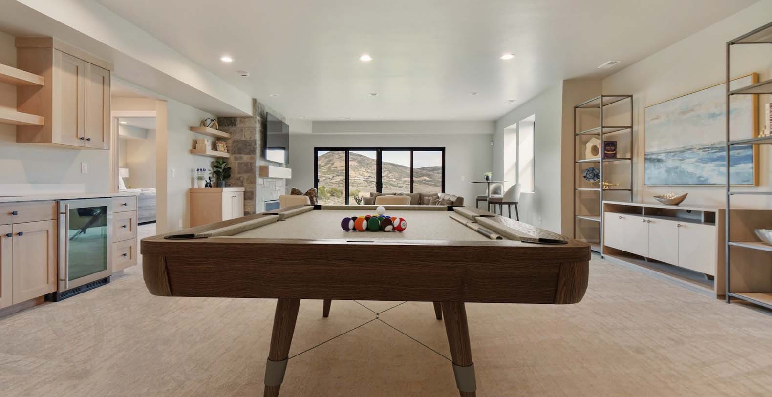 On the lower level, an additional living area awaits, designed for unwinding and indoor fun. Enjoy friendly competition at the pool table near the convenient wet bar, or relax in the inviting seating area equipped with a comfortable sectional, gas fireplace, and TV, complemented by a high-top table for two and glass doors that lead to the patio. This floor also includes a guest bedroom with a king bed.