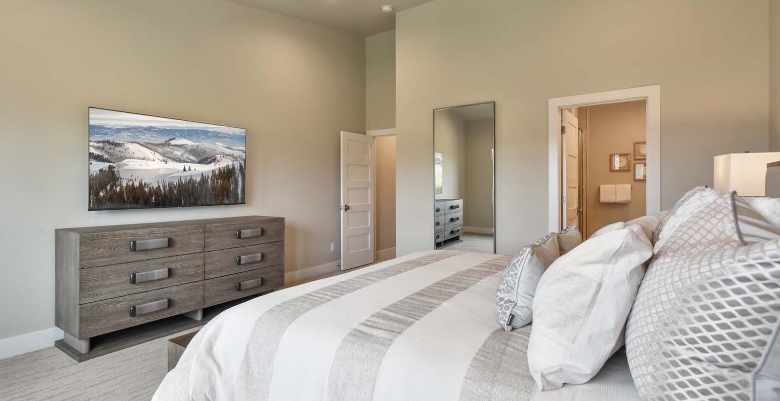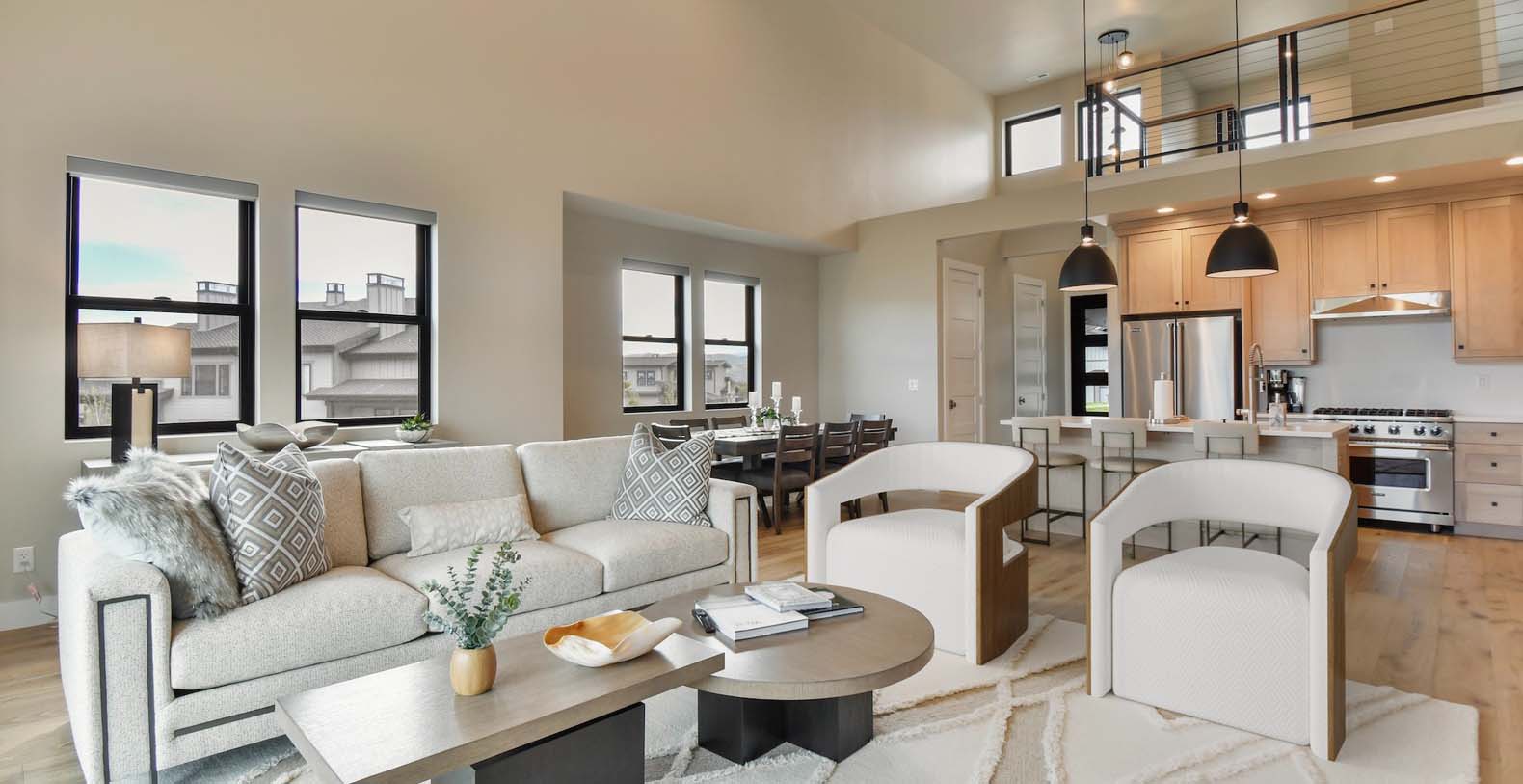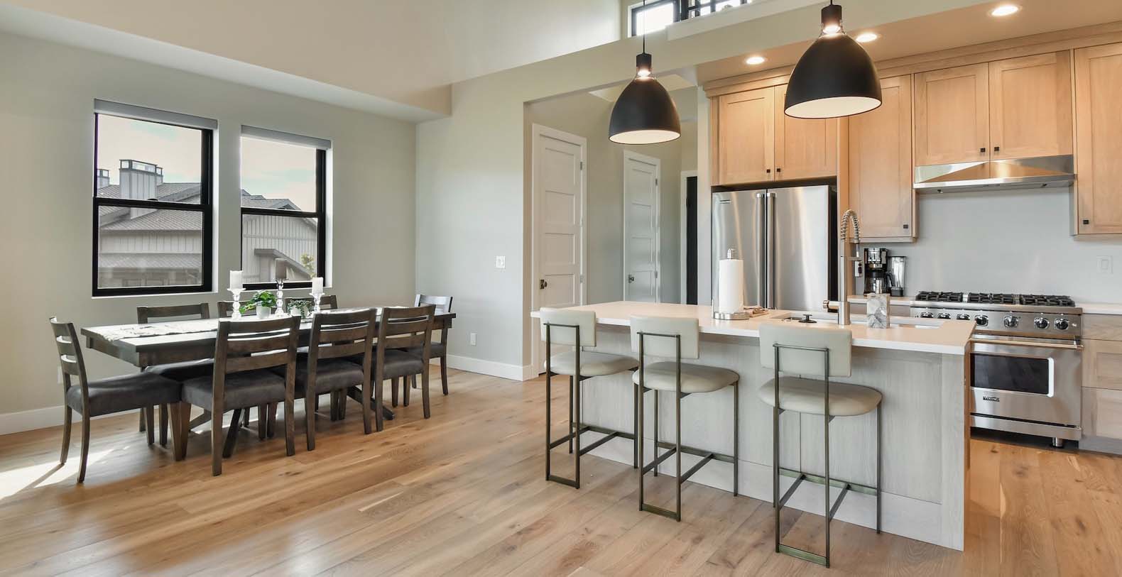 Upon entering this contemporary townhome on the second level, you’ll be greeted by a calming palette of pale wood and white walls, setting a serene atmosphere for relaxation. The stylish kitchen boasts quartz countertops and high-end Viking appliances, with an open layout that includes a 3-seat island/breakfast bar for effortless entertaining. A dining table accommodating eight adds to the spacious feel. Gather in the cozy living area, where a soaring stone-surround fireplace and mounted TV create the perfect setting for chilly nights spent sipping cocoa by the fire. On warmer days, step out to the attached balcony for barbecues and breathtaking views of the sparkling reservoir below. The stunning primary bedroom is conveniently located off the living area and features a king bed, Smart TV, private bathroom, and access to the balcony.
