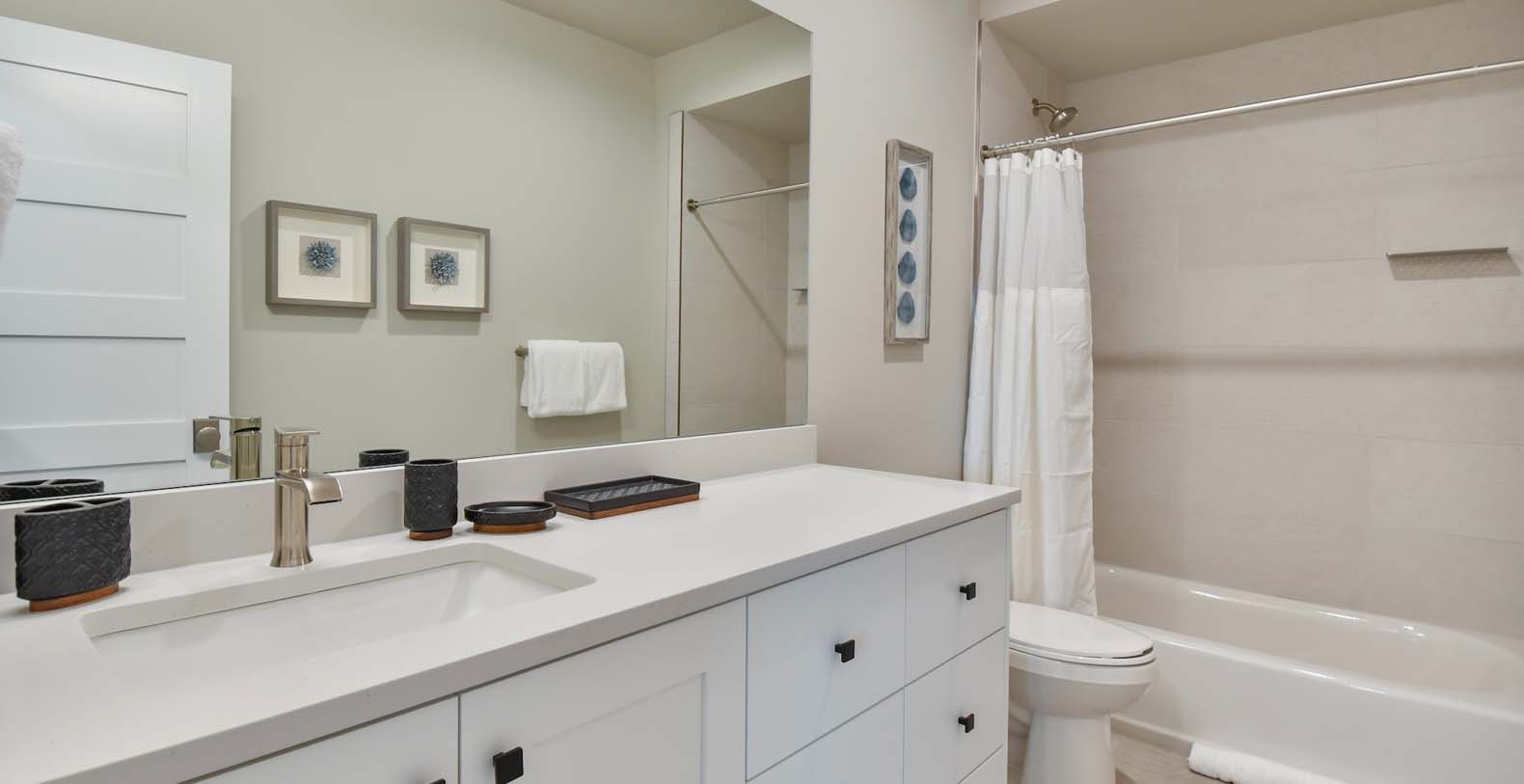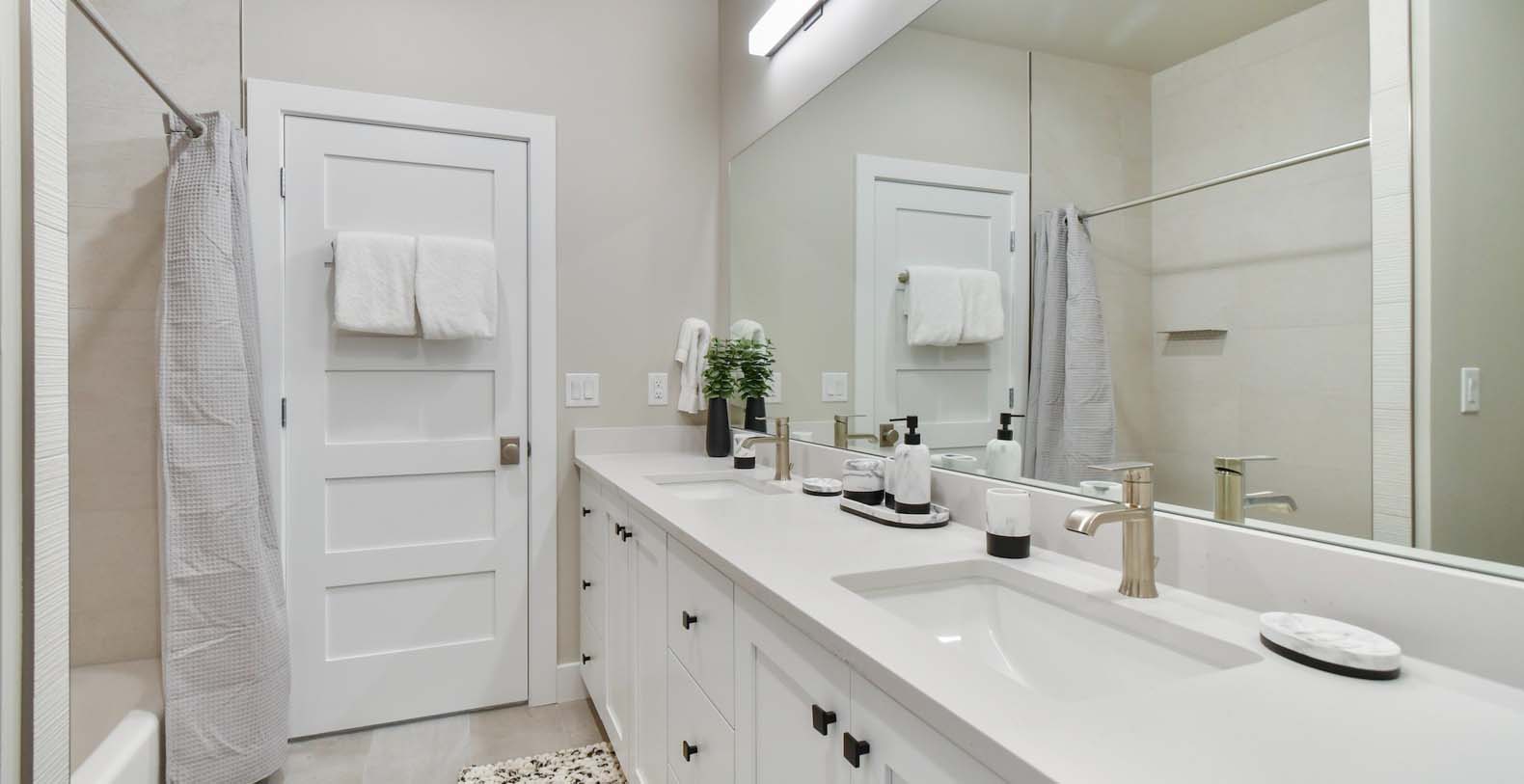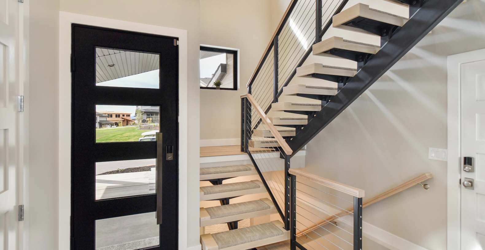 Ascend the sleek floating staircase to the top floor, where you’ll find another guest bedroom with a king bed, TV, and private bathroom, as well as a bedroom featuring a twin-over-king bunk bed.