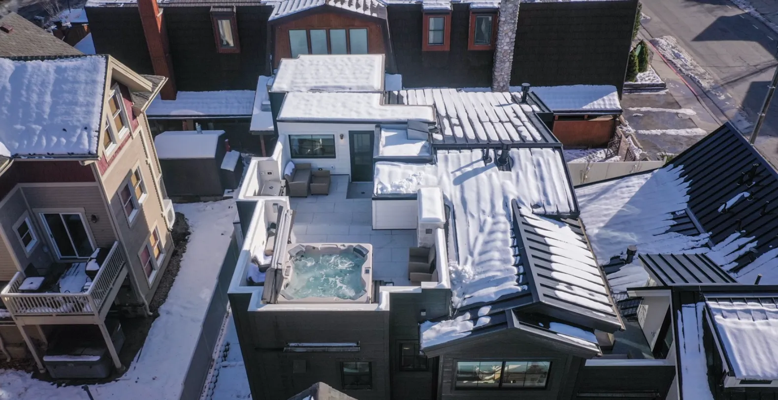 One of the standout features of Powder Day Chalet is the rooftop patio, a true private oasis above it all. Here, guests can unwind in the bubbling hot tub beneath the stars while taking in beautiful mountain views, a perfect way to soothe tired muscles after skiing or hiking. The rooftop space adds an exceptional outdoor dimension to this luxury Park City vacation rental.