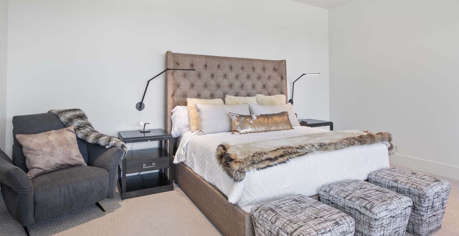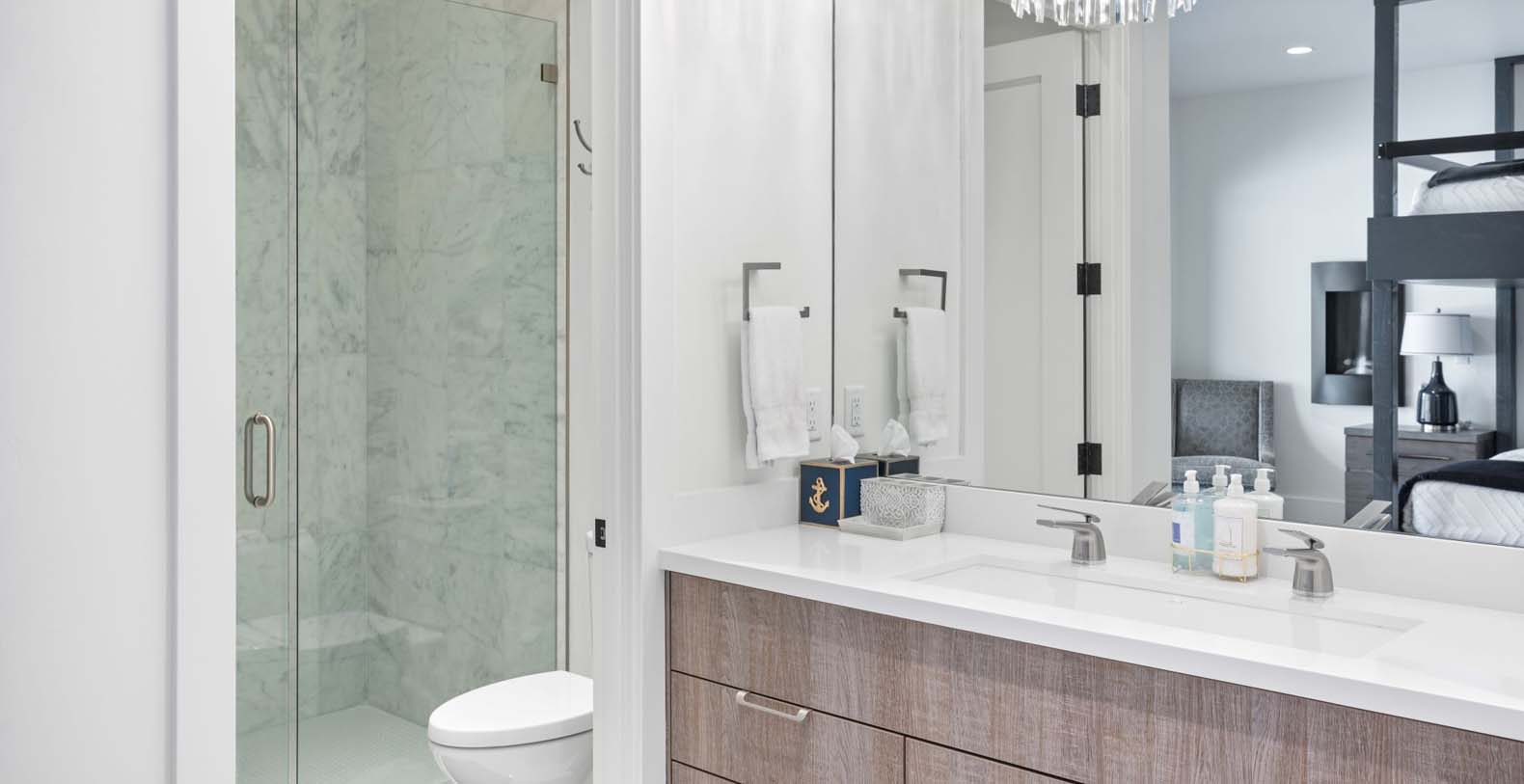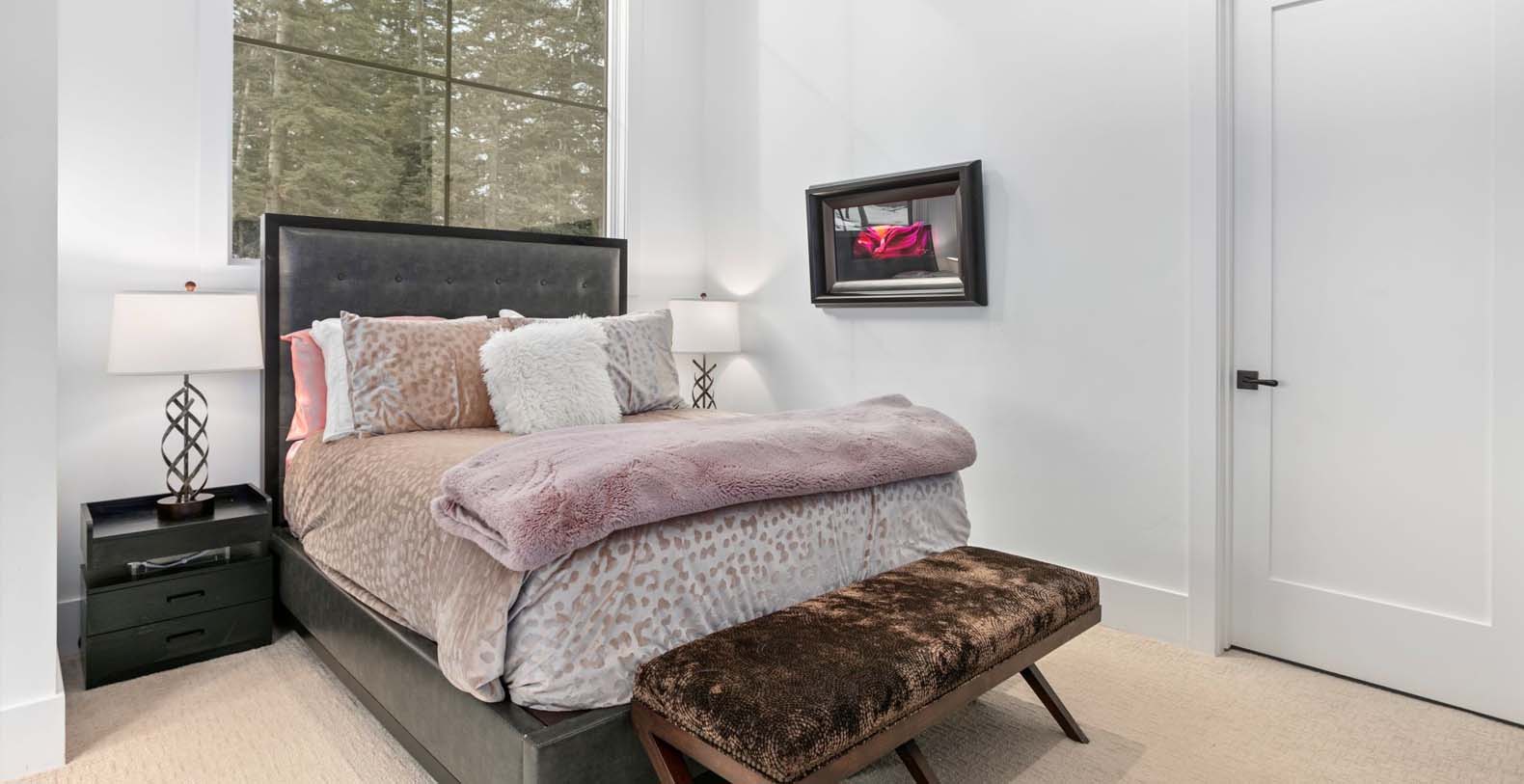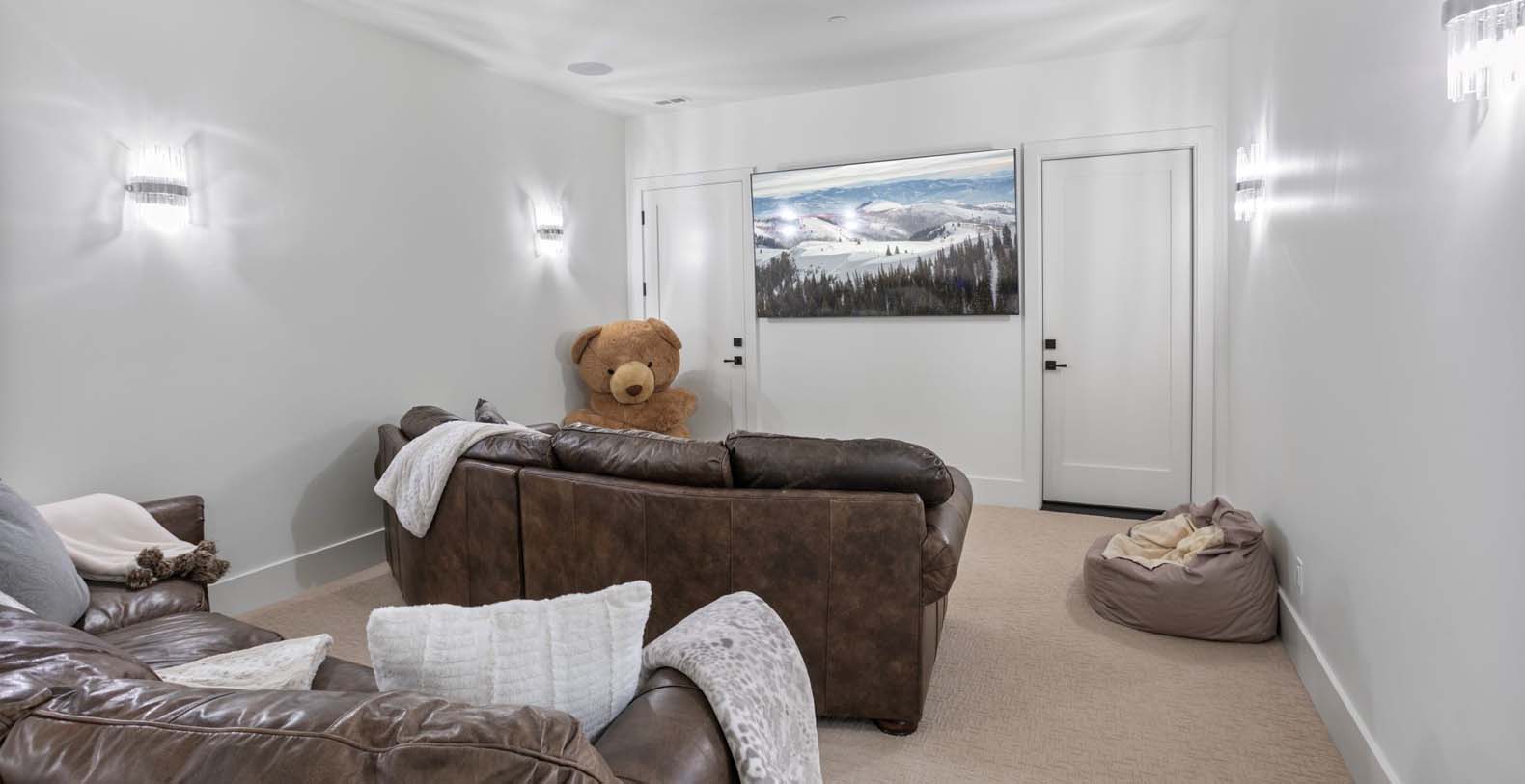 The lower level features a fully-equipped in-house gym, a cozy theater room, and an additional living area with access to the back patio. Outdoors, unwind in the private hot tub or gather around the firepit for a relaxing evening. The bottom floor includes a guest bedroom with a king bed and private bath, as well as a bunk room with two queen-over-queen beds and a double bathroom with two showers and toilets. An organized ski room with lockers and a trail map makes for easy gear storage and access to the slopes.