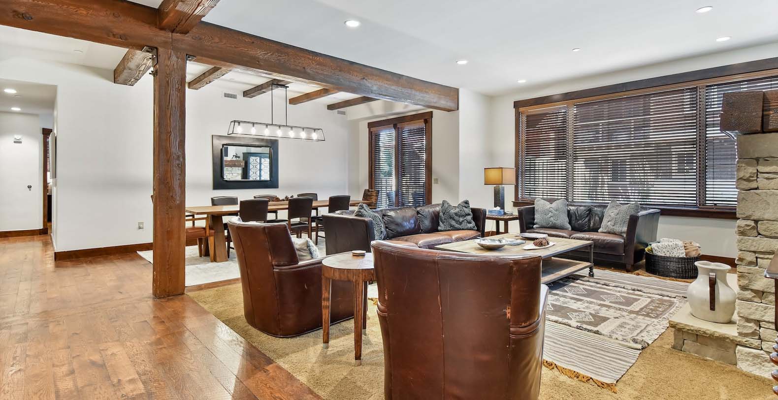 Inside, hardwood floors, leather furnishings, and rustic beams create a warm, inviting atmosphere. Relax by the gas fireplace in the cozy living area or enjoy quiet evenings watching TV. The spacious dining area seats 8, with additional seating for 3 at the breakfast bar, perfect for shared meals and conversations. The chef’s kitchen is fully equipped with high-end appliances and an open design that facilitates easy entertaining, complemented by a sound system for background music. Step outside through the glass door to your outdoor seating area, complete with a grill, hot tub, and beautiful mountain views—ideal for unwinding after a day on the slopes.