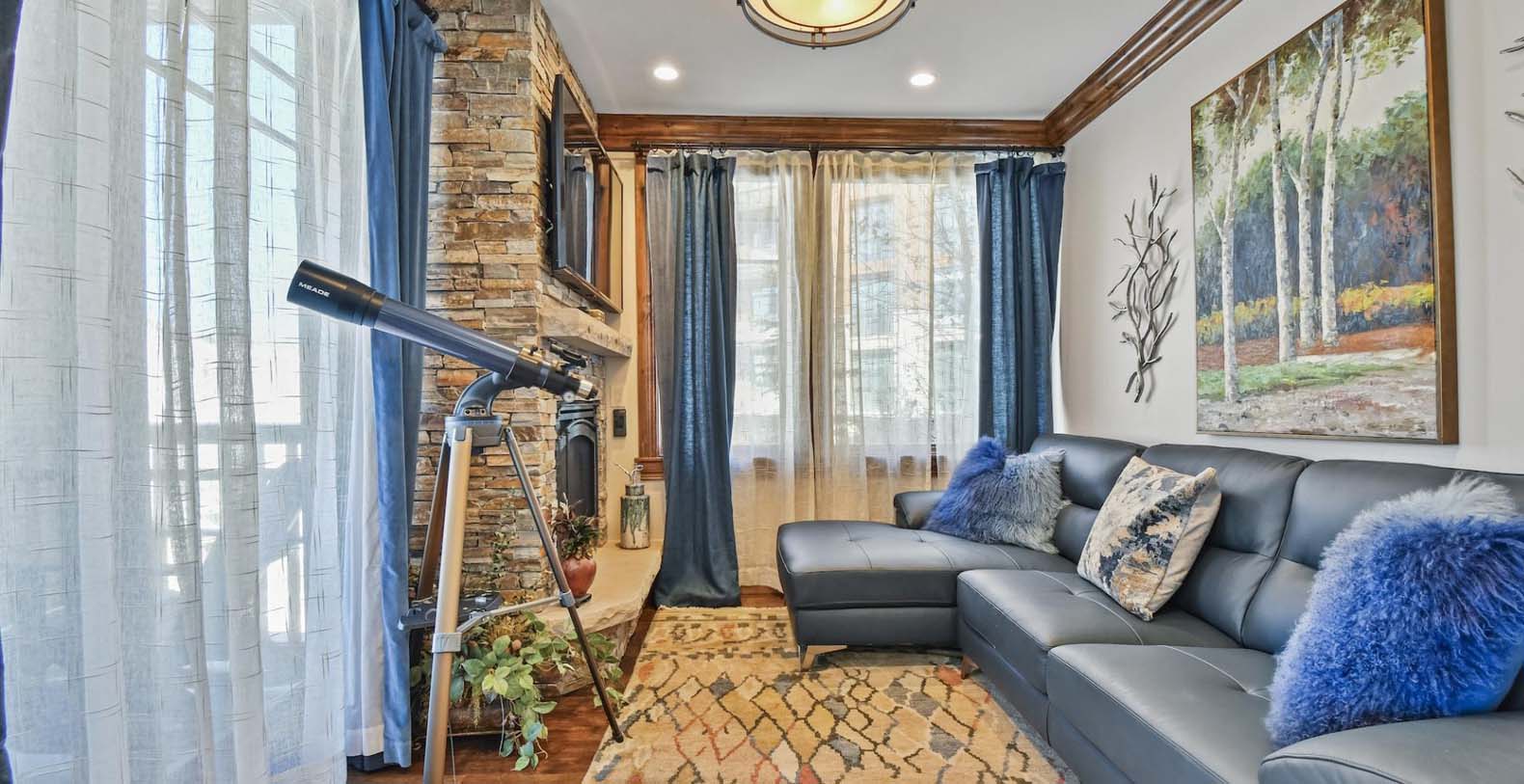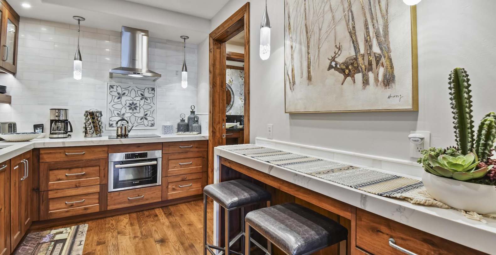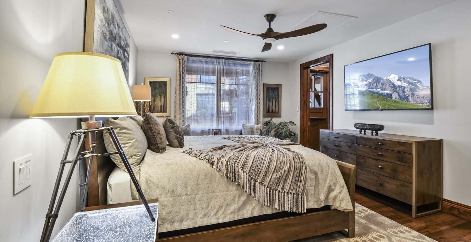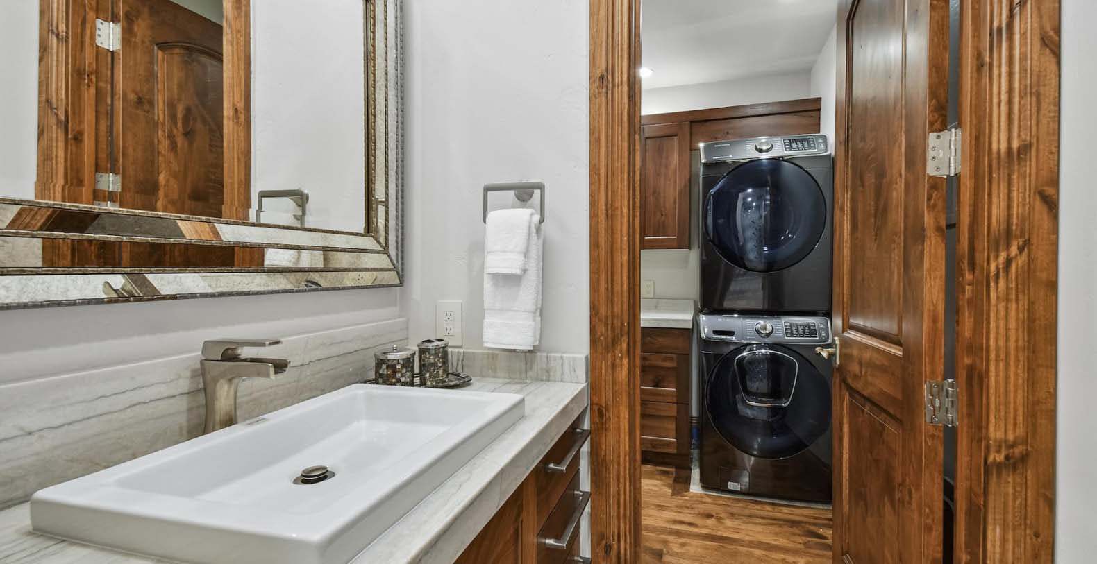 Inside this single-story condo, an enchanting blend of natural textures, modern finishes, and vibrant accents creates a charming and stylish environment. The elegant kitchenette features a Bosch convection oven and Wolf induction stovetop for preparing meals, complemented by a wall-mounted breakfast bar for two. When night falls, the primary bedroom offers a king bed, sweeping mountain views, a private bathroom, TV, and a sitting area. Warm up by the gas fireplace on the plush L-shaped couch and watch your favorite shows. Use the provided telescope on the balcony for a late-night gaze at the starry Utah sky! The guest bedroom also has a king bed, TV, private bathroom, and exterior entry to the home. Near the entrance are hooks for outdoor gear and a laundry room for freshening up athletic wear.