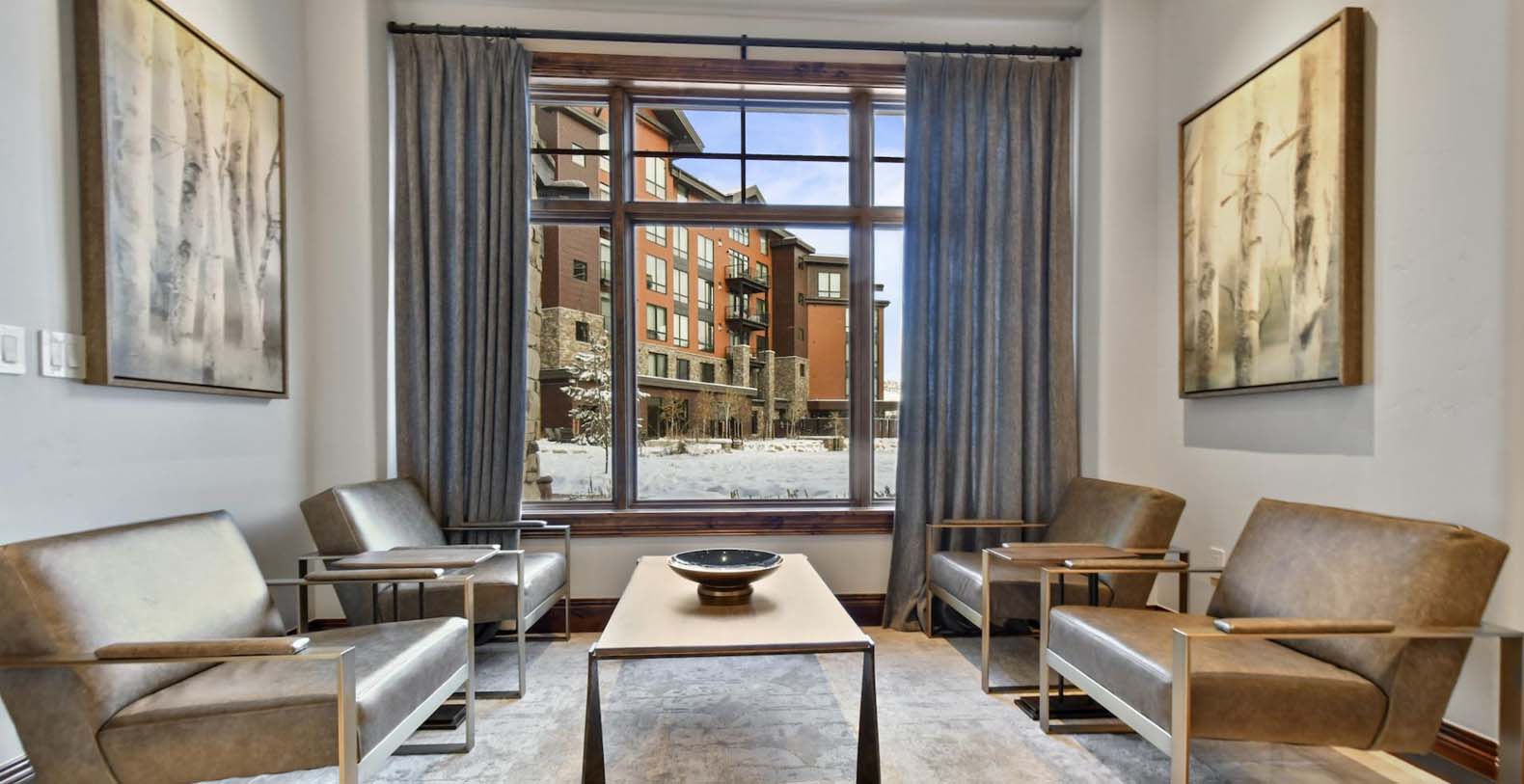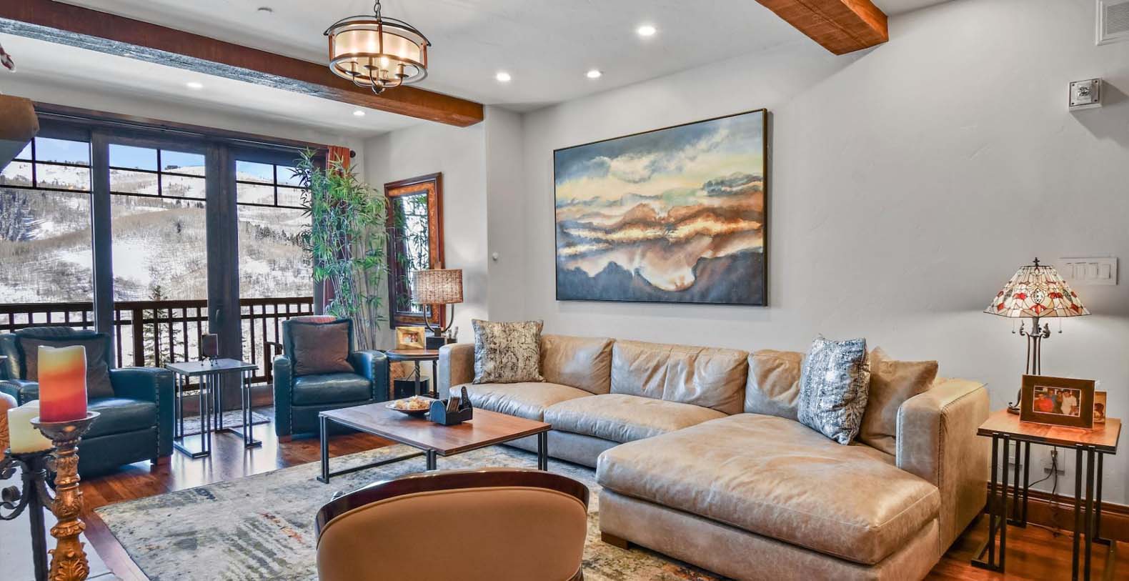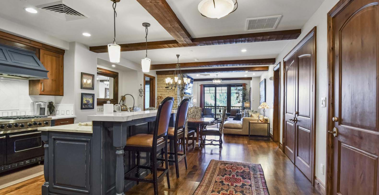 Step inside and discover a wonderful blend of mountain-inspired décor, contemporary furnishings, and luxurious finishes in this single-story condo. The chef’s kitchen is perfect for whipping up everything from intimate dinners to lively family breakfasts, equipped with top-of-the-line Viking appliances. Enjoy meals at the dining table for 6, with extra seating for 2 at the breakfast bar. In the living area, a plush leather L-shaped couch and 3 stylish armchairs surround a grand stone fireplace and a 65” TV, creating an inviting space to unwind. Savor peaceful evenings by the flickering flames with cocktails or hot cocoa while gazing out at the snow-covered mountains through the picture window. Both the primary and guest bedrooms offer a luxurious retreat, featuring king beds, private bathrooms, and Smart TVs. The primary bedroom also includes a private patio, where you can greet the morning with fresh mountain air.