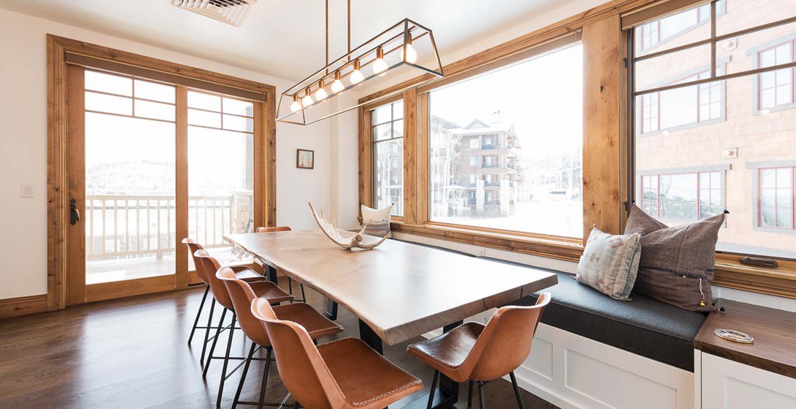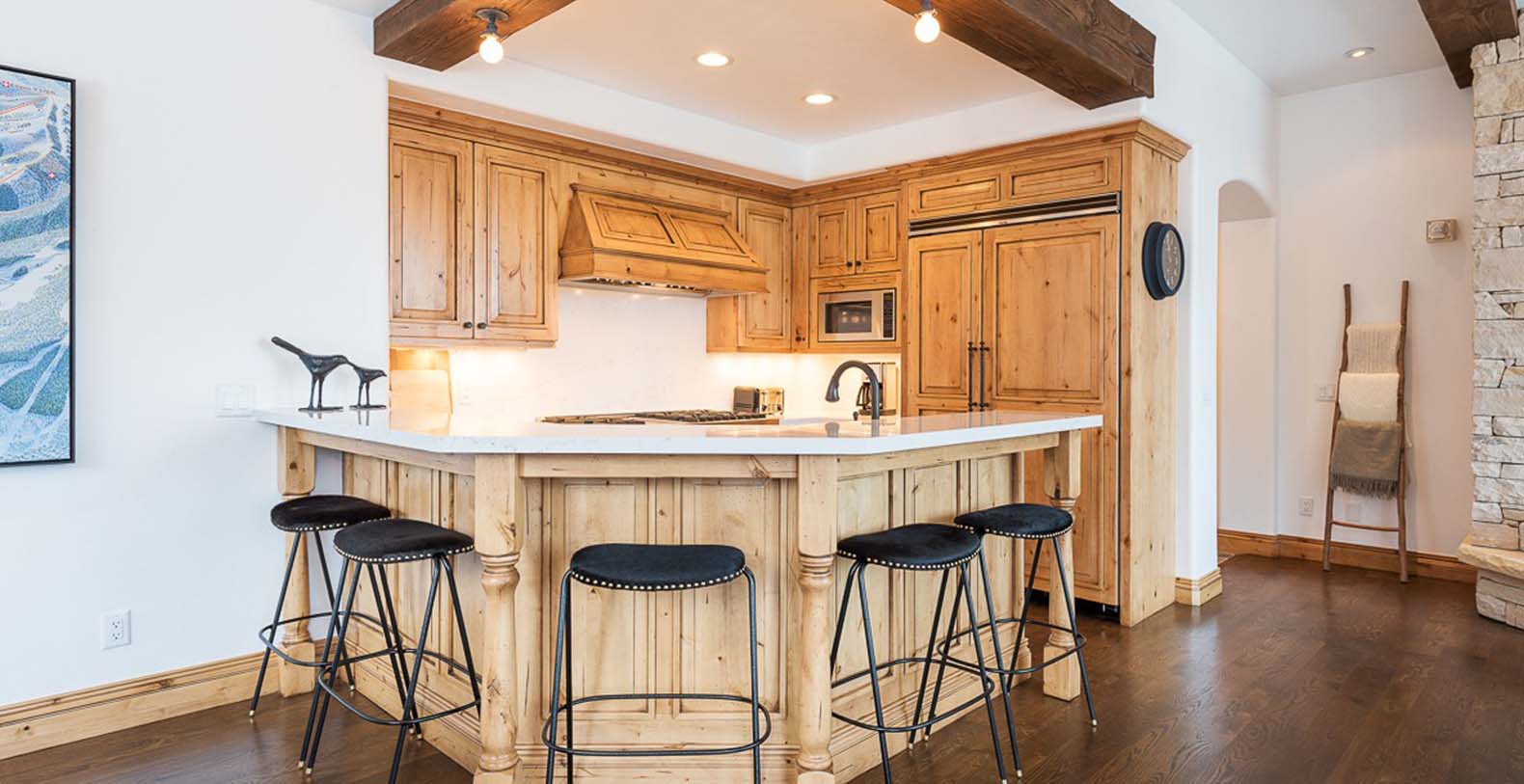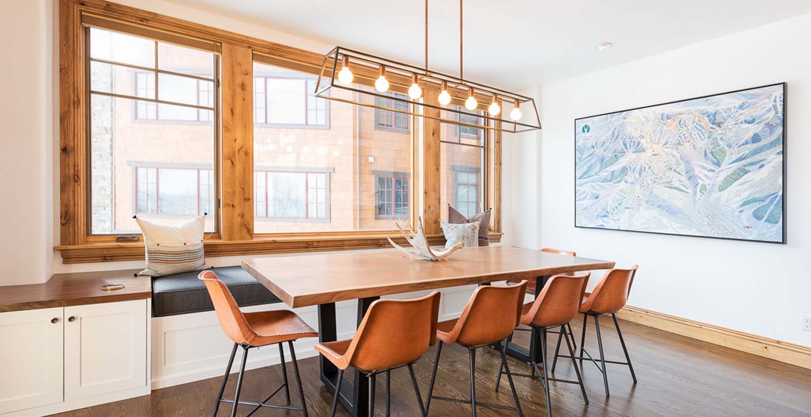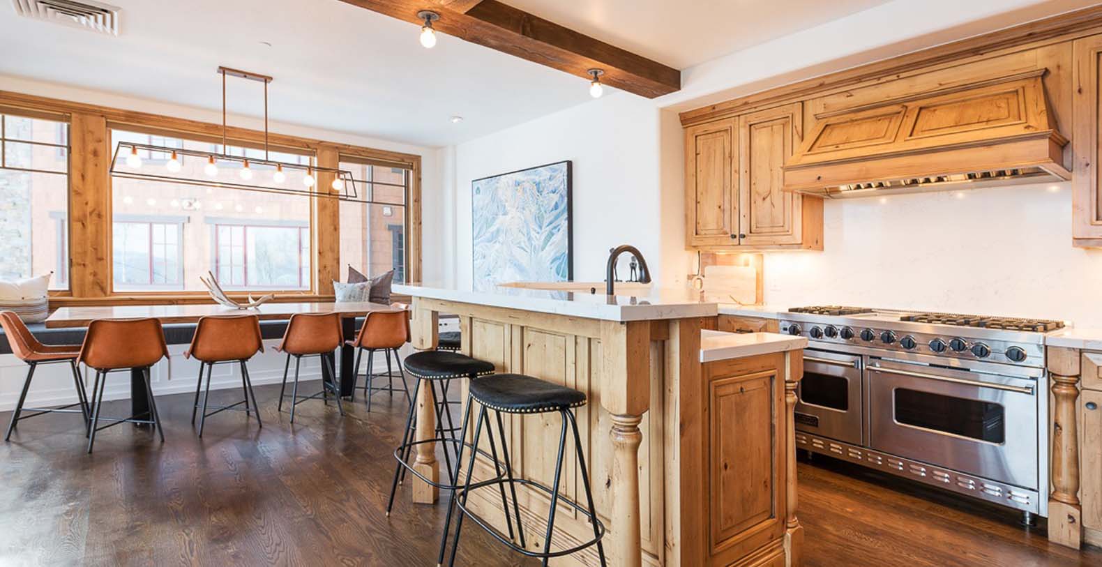 Inside this enchanting retreat, roughcut timber beams, minimalist mountain décor, and a massive stone fireplace create a cozy atmosphere. Large wood-trimmed windows frame the majestic mountain scenery, filling the space with natural light. In the living area, unwind on the spacious white corner sofa after a day of adventure. Chilly winter nights call for warming the gas fireplace, while warm summer evenings invite guests to step onto the balcony and enjoy the fresh alpine air. The gourmet kitchen features Viking appliances, slab granite countertops, and a 5-person breakfast bar—perfect for quick meals or après-ski drinks. The dining table, with cushioned banquette seating beneath the window, is an ideal spot to plan the day over coffee and tea. For restful nights, retreat to the primary bedroom with a king bed, cozy gas fireplace, private deck, TV, mountain views, and a private bathroom with heated floors. Additional sleeping options include a guest bedroom with a queen bed and two bunk rooms: one with a twin-over-full bunk bed, and the other with a twin-over-full bunk plus a full Murphy bed.