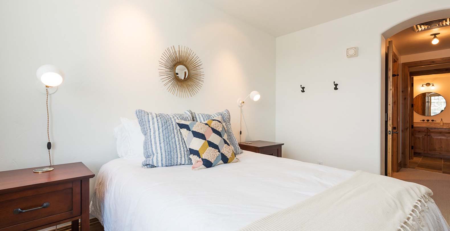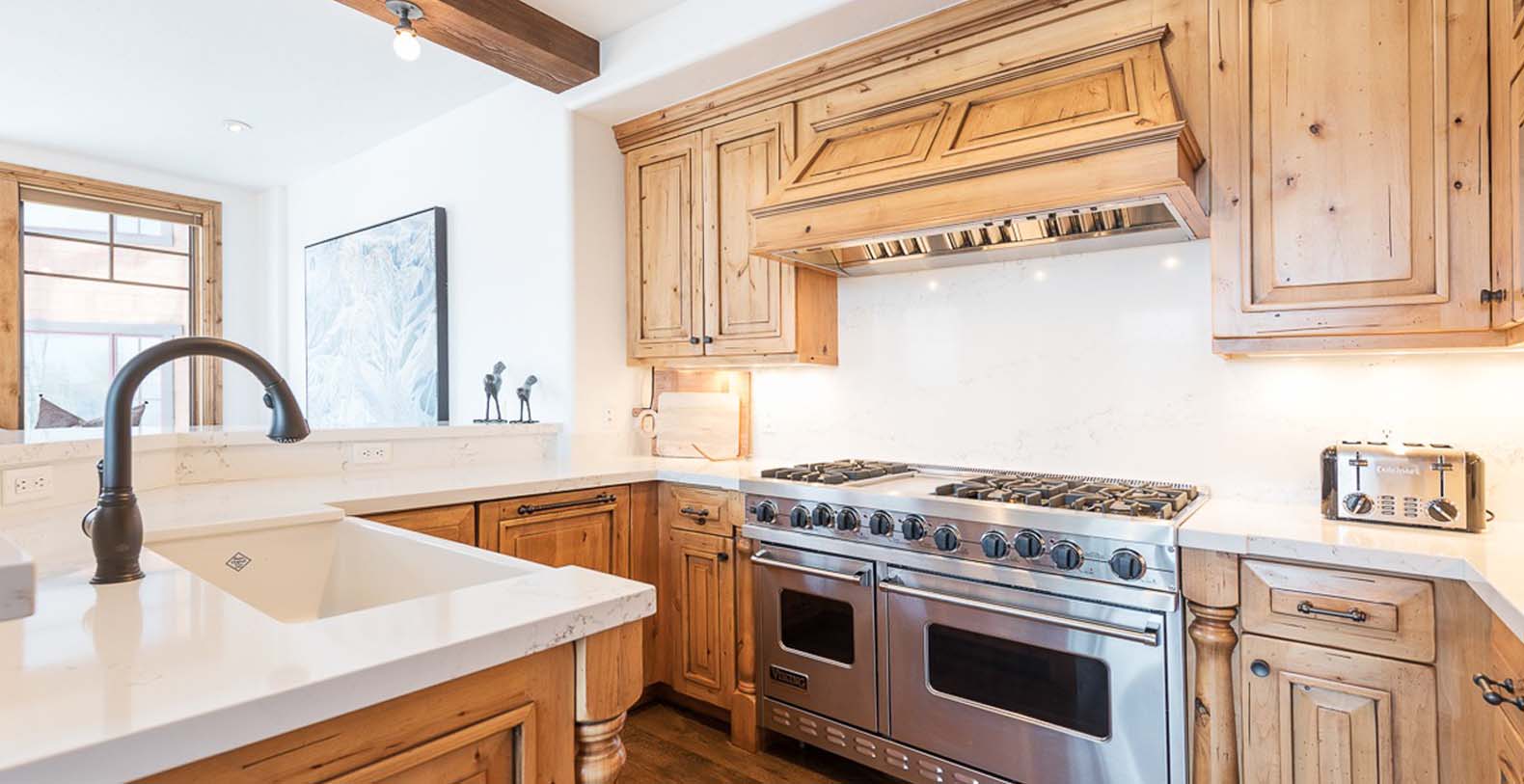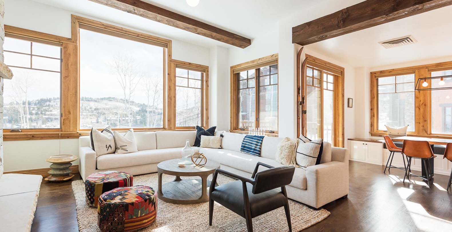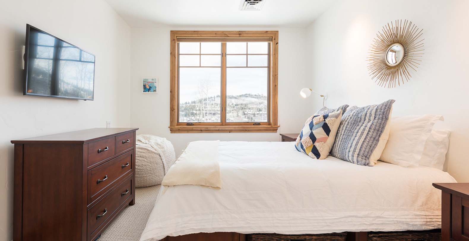 Inside this enchanting retreat, roughcut timber beams, minimalist mountain décor, and a massive stone fireplace create a cozy atmosphere. Large wood-trimmed windows frame the majestic mountain scenery, filling the space with natural light. In the living area, unwind on the spacious white corner sofa after a day of adventure. Chilly winter nights call for warming the gas fireplace, while warm summer evenings invite guests to step onto the balcony and enjoy the fresh alpine air. The gourmet kitchen features Viking appliances, slab granite countertops, and a 5-person breakfast bar—perfect for quick meals or après-ski drinks. The dining table, with cushioned banquette seating beneath the window, is an ideal spot to plan the day over coffee and tea. For restful nights, retreat to the primary bedroom with a king bed, cozy gas fireplace, private deck, TV, mountain views, and a private bathroom with heated floors. Additional sleeping options include a guest bedroom with a queen bed and two bunk rooms: one with a twin-over-full bunk bed, and the other with a twin-over-full bunk plus a full Murphy bed.
