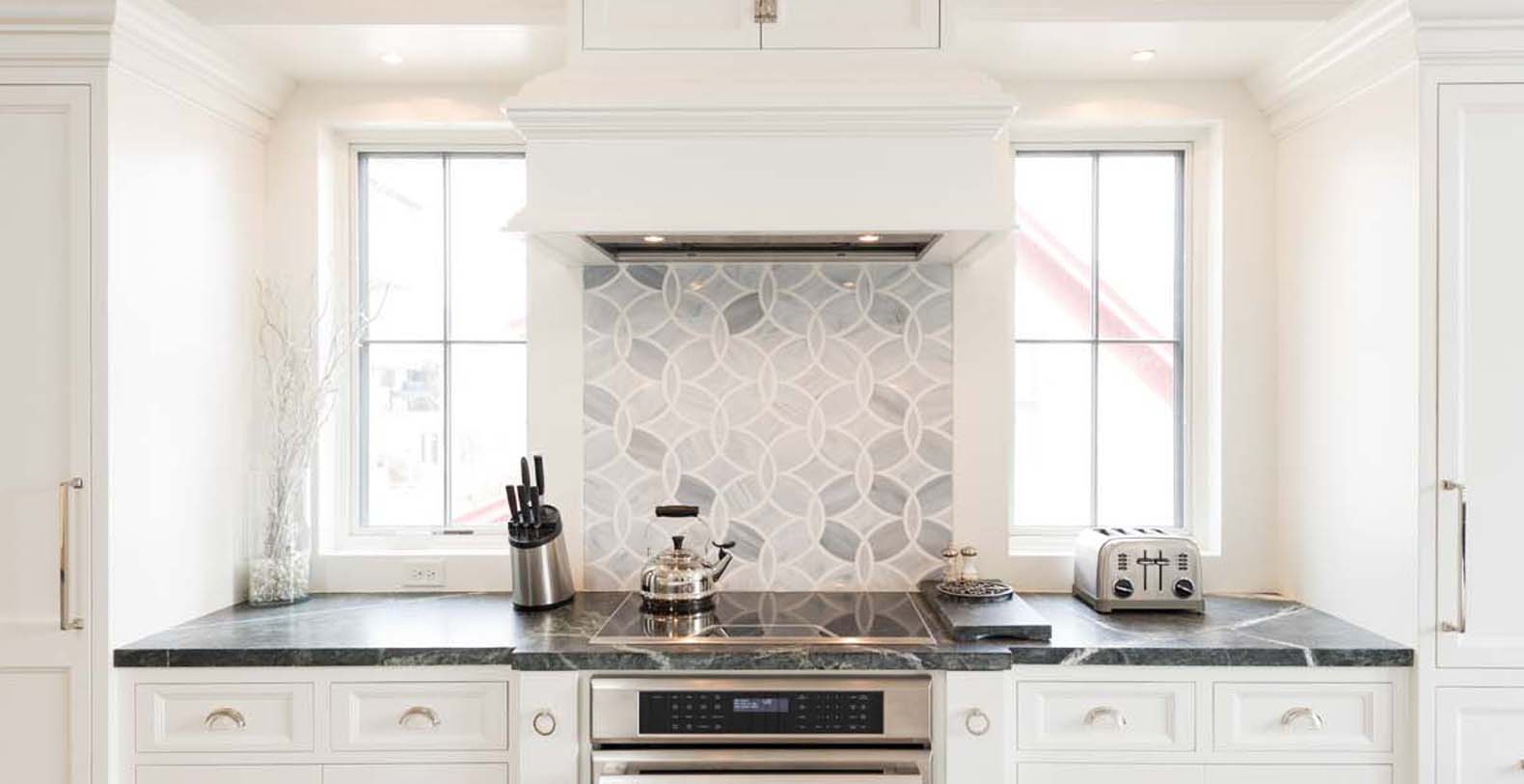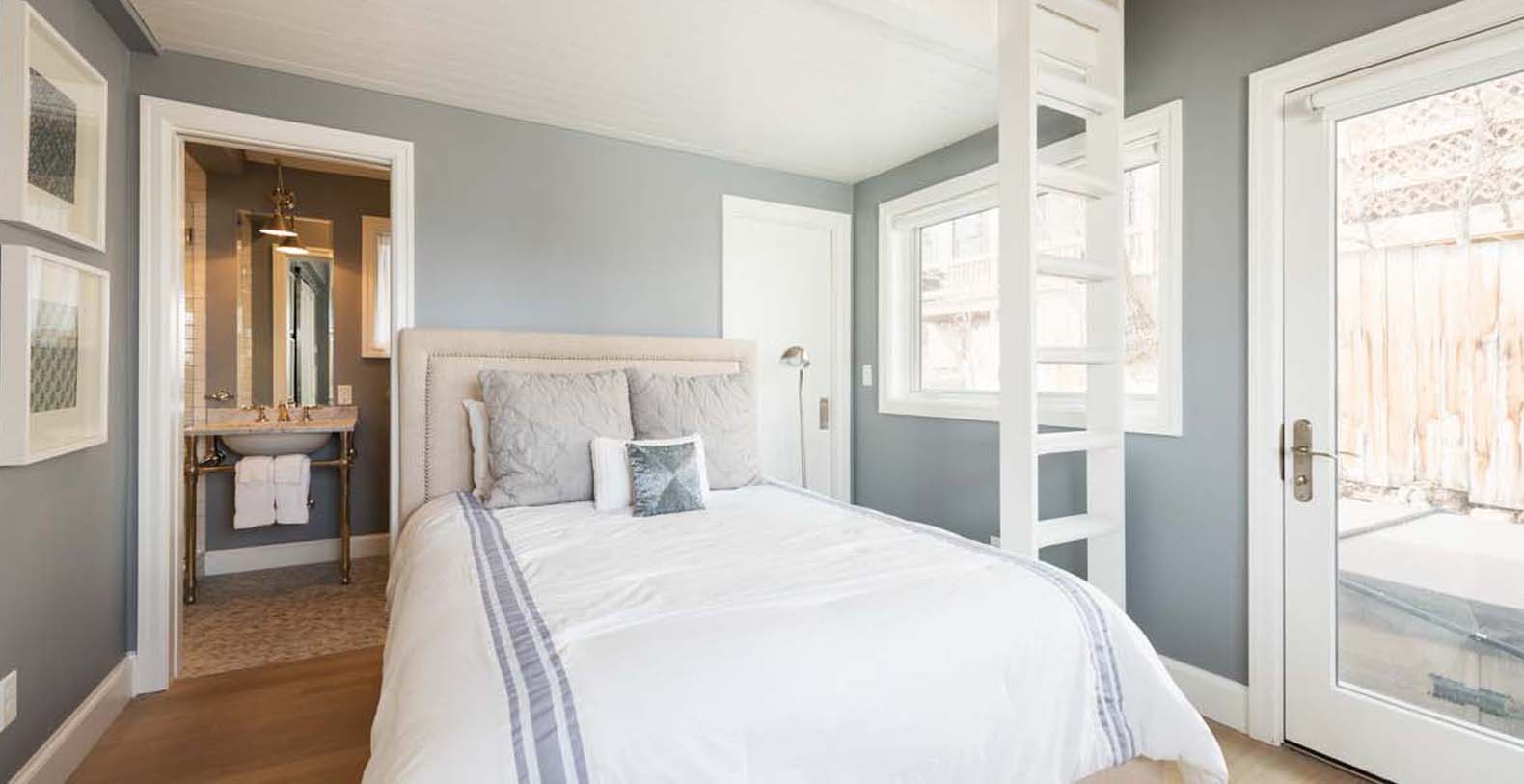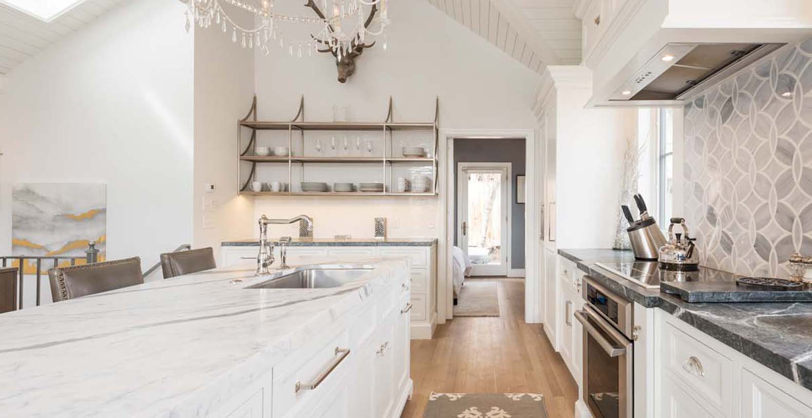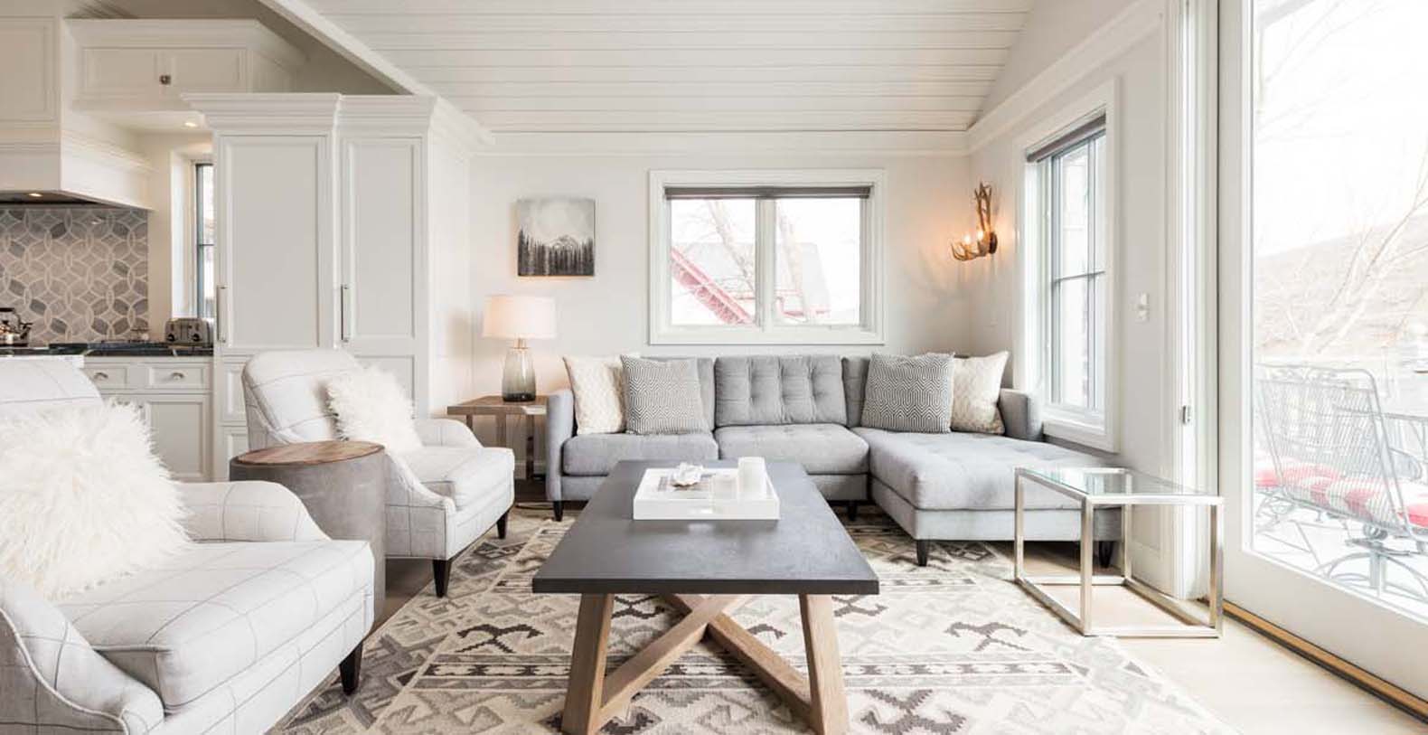 Shades of snowy white and peaceful gray adorn the open, bright great room on the top level. Sunbeams filter through the skylight within the vaulted tongue-and-groove ceiling, while a sparkling chandelier adds ethereal elegance. The chef of the group will appreciate the Thermador appliances and the spacious 4 seat breakfast bar for prep or entertaining. In the living area, a comfortable chaise sofa and plaid armchairs provide plenty of seating for cozy evenings by the marble-surround fireplace or enjoying TV. An attached balcony overlooking the town invites guests outside for a nightcap. Off the kitchen, the patio features a grill for après-ski barbecues or a soak in the hot tub’s warm waters. This level also includes a guest bedroom with a full-over-full bunk bed, a private bathroom, and patio access.