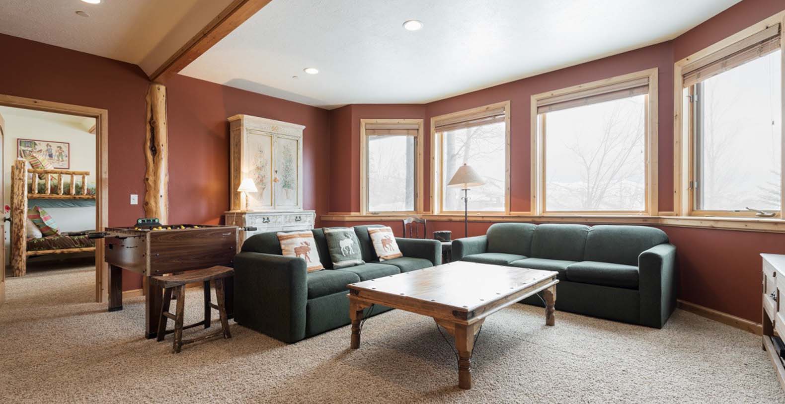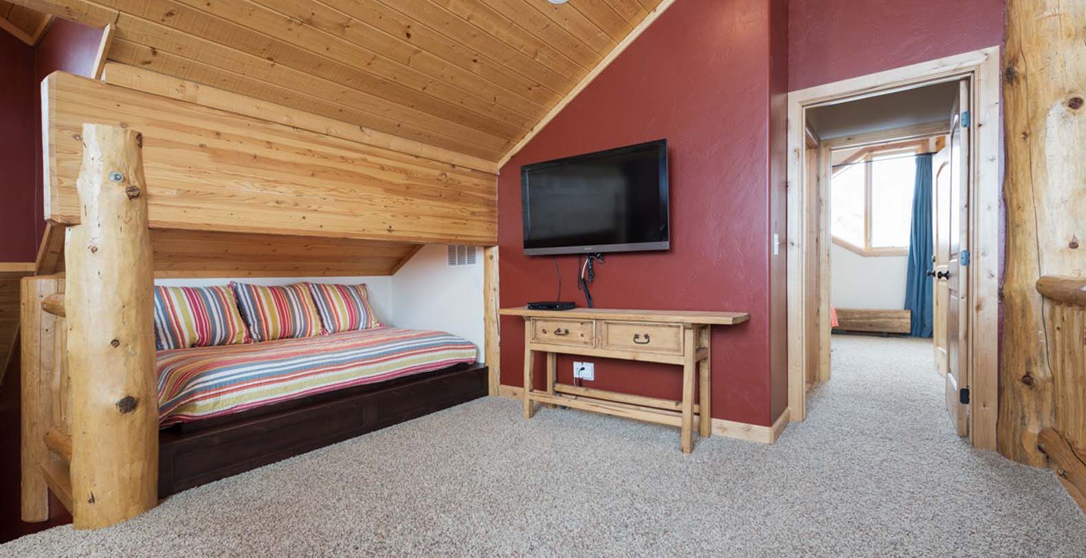 Descend to the ground floor for the perfect way to soothe sore muscles after a day exploring the slopes, trails, or golf course—utilize the private hot tub on the patio. A den offers fun for everyone with 2 sleeper sofas (a full and a single), a foosball table, a fireplace, and a TV. The kid-friendly bunk room has 2 twin-over-twin beds, and another guest bedroom is furnished with a king bed, a TV, and a private bathroom. On the third level, a cozy loft provides soft seating and a TV, along with an adjoining guest bedroom featuring a queen bed and a private bathroom.