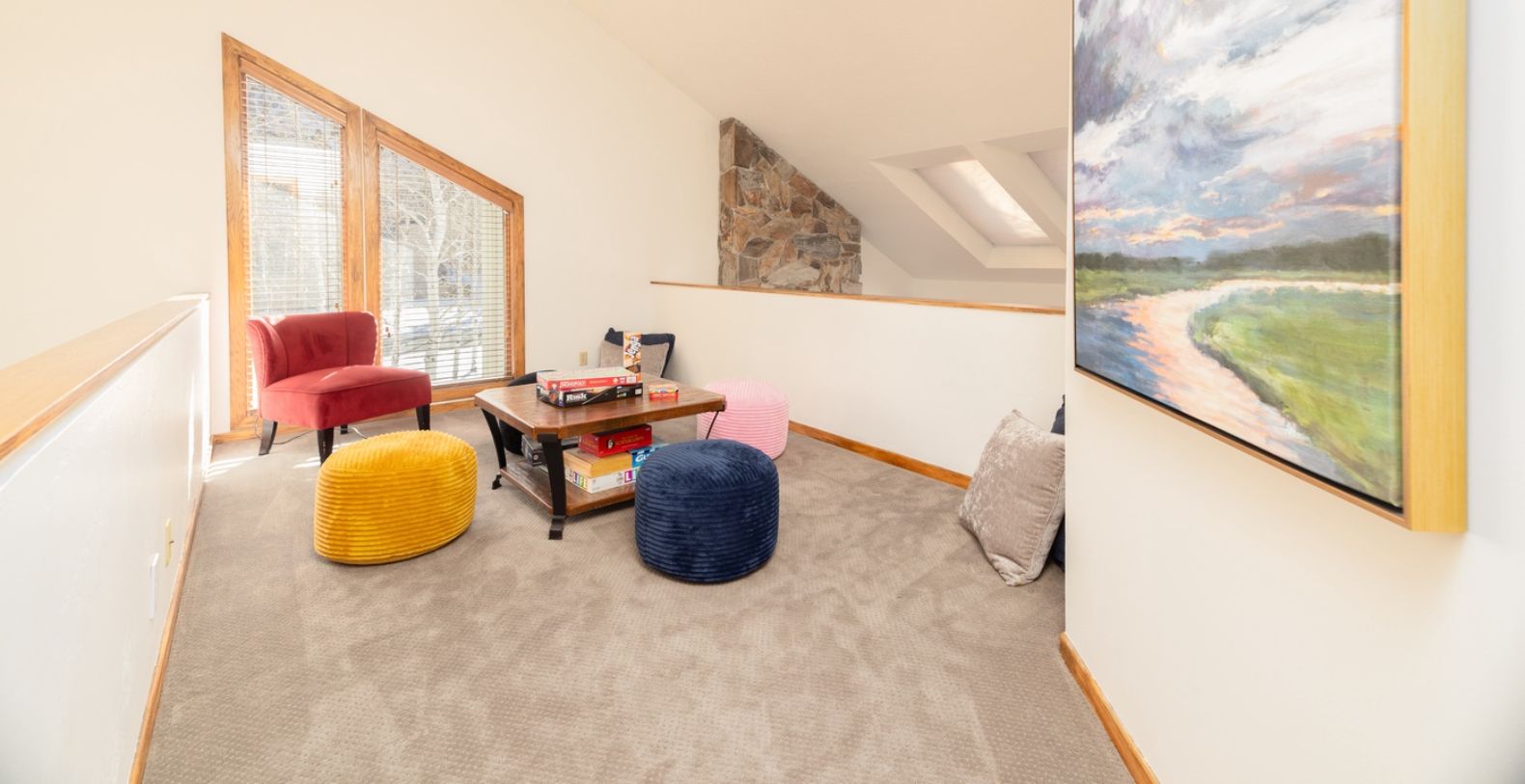 Inside, the chalet welcomes you with soaring vaulted ceilings and a bright, open-concept layout that connects the living, dining, and kitchen areas seamlessly. The living room is centered around a beautiful stone fireplace, creating a cozy gathering space after a day on the slopes, while expansive windows fill the home with natural light and frame picturesque mountain views. Plush seating and tasteful mountain-inspired décor give the space a relaxed yet refined atmosphere.