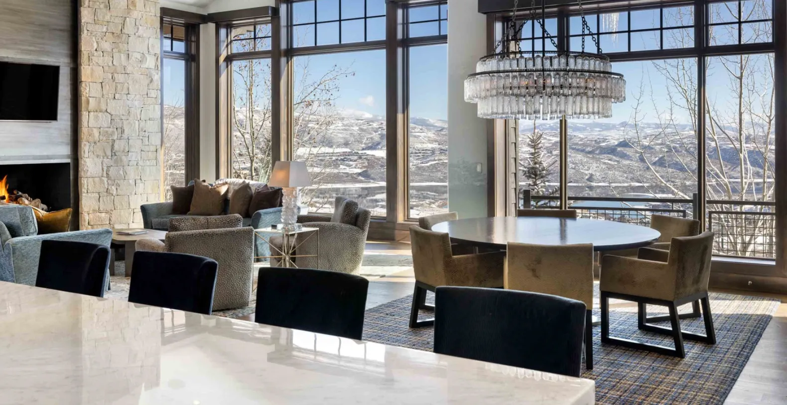 From the moment you enter, you’re greeted by a magnificent open-concept living area with vaulted ceilings and a grand stone fireplace anchoring the room. Floor-to-ceiling windows reveal breathtaking east-facing views over the lake and surrounding mountains, flooding the interiors with natural light. Elegant hardwood floors, refined finishes, and modern furnishings create an inviting yet elevated mountain retreat. The gourmet kitchen is fully equipped with top-of-the-line appliances, custom cabinetry, and a generous marble island with bar seating. Adjacent to it, the formal dining area frames panoramic alpine views beneath a striking crystal chandelier, ideal for family dinners or entertaining guests. A cozy secondary living room with its own fireplace provides an intimate setting for quiet evenings by the fire.