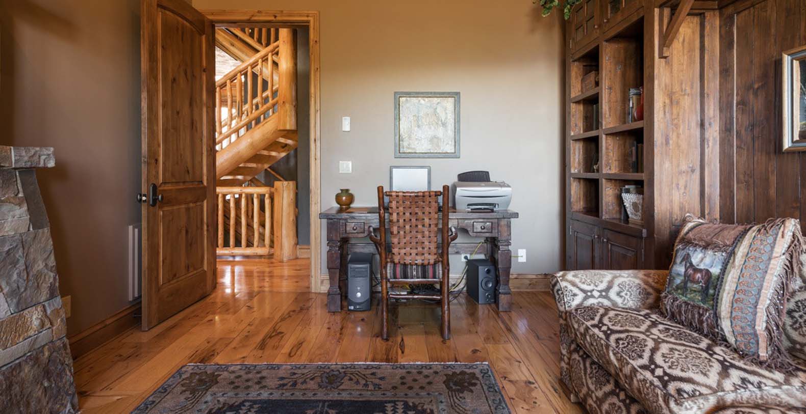 Exposed logs and vaulted wood ceilings create a picturesque retreat inside this expansive three-level cabin. The living area features two elegant sofas and two armchairs arranged around a floor-to-ceiling fireplace and TV, with soaring windows framing views of Lake Jordanelle. Aspiring chefs will appreciate the gourmet kitchen, equipped with a Thermador 6-burner gas stove and Nespresso machine. Sip a decadent coffee on the wraparound deck overlooking the mountains and lake, perfect for soaking in the scenery. For meals, there are two dining tables—one seating six and the other eight—as well as three additional seats at the breakfast bar. The main floor’s primary bedroom boasts a king bed, TV, private bathroom with a gas fireplace, and deck access—providing a cozy and private retreat.
