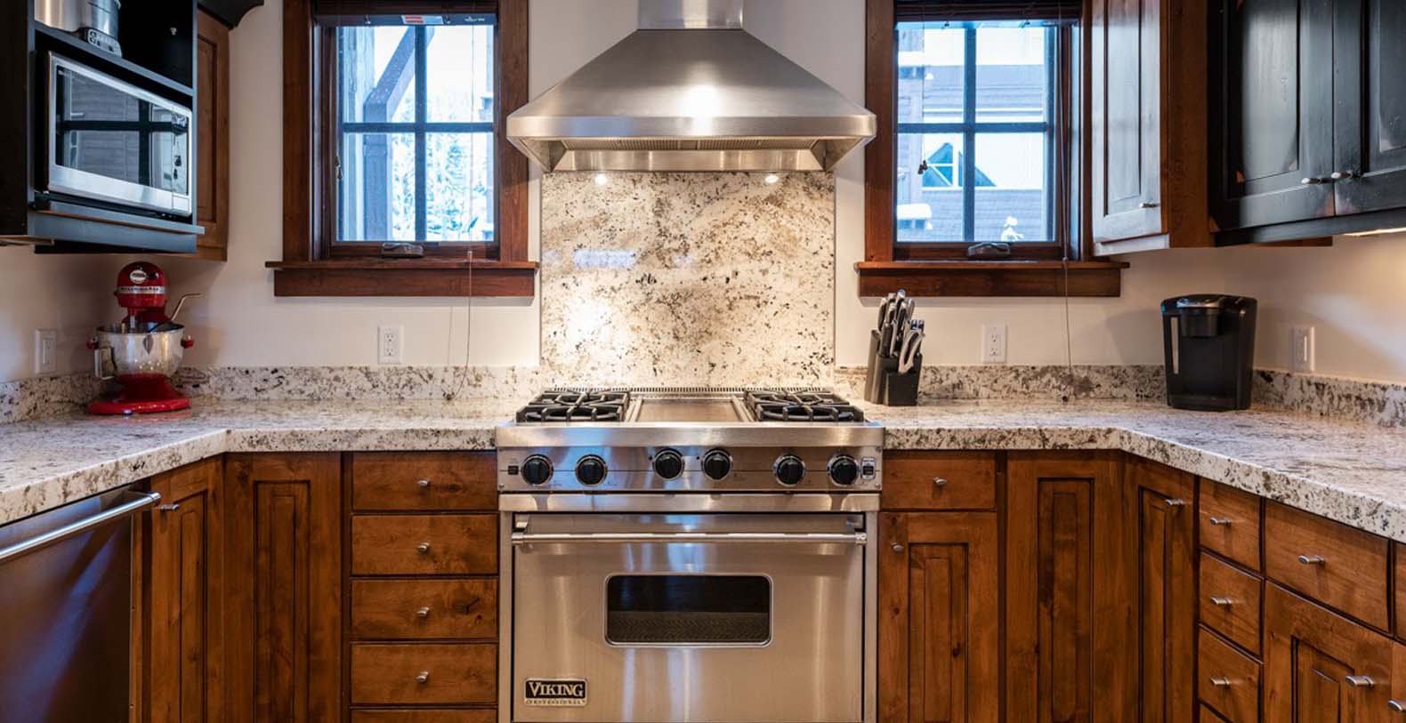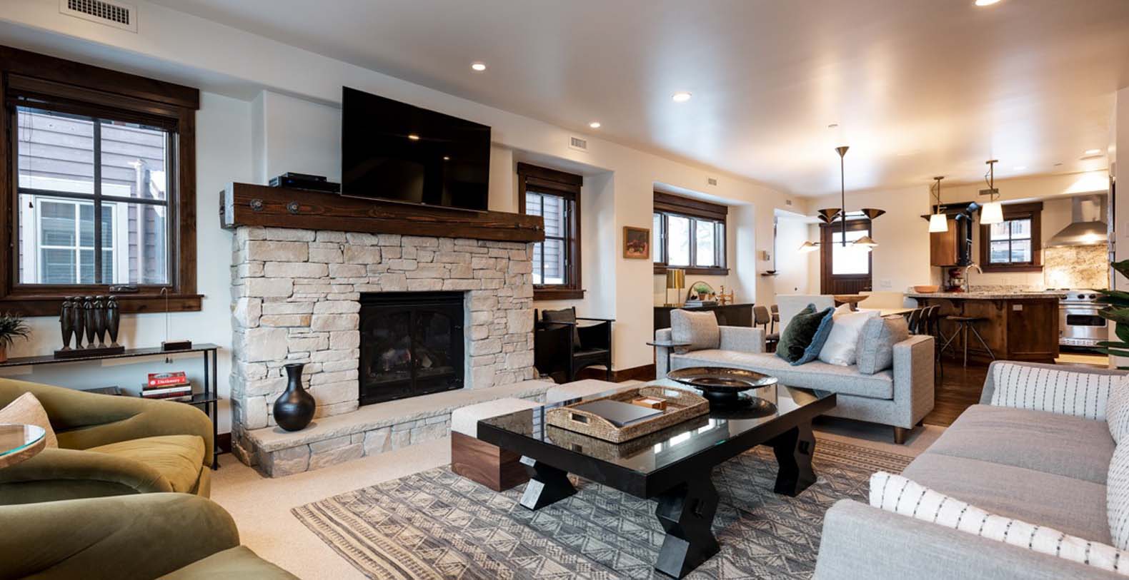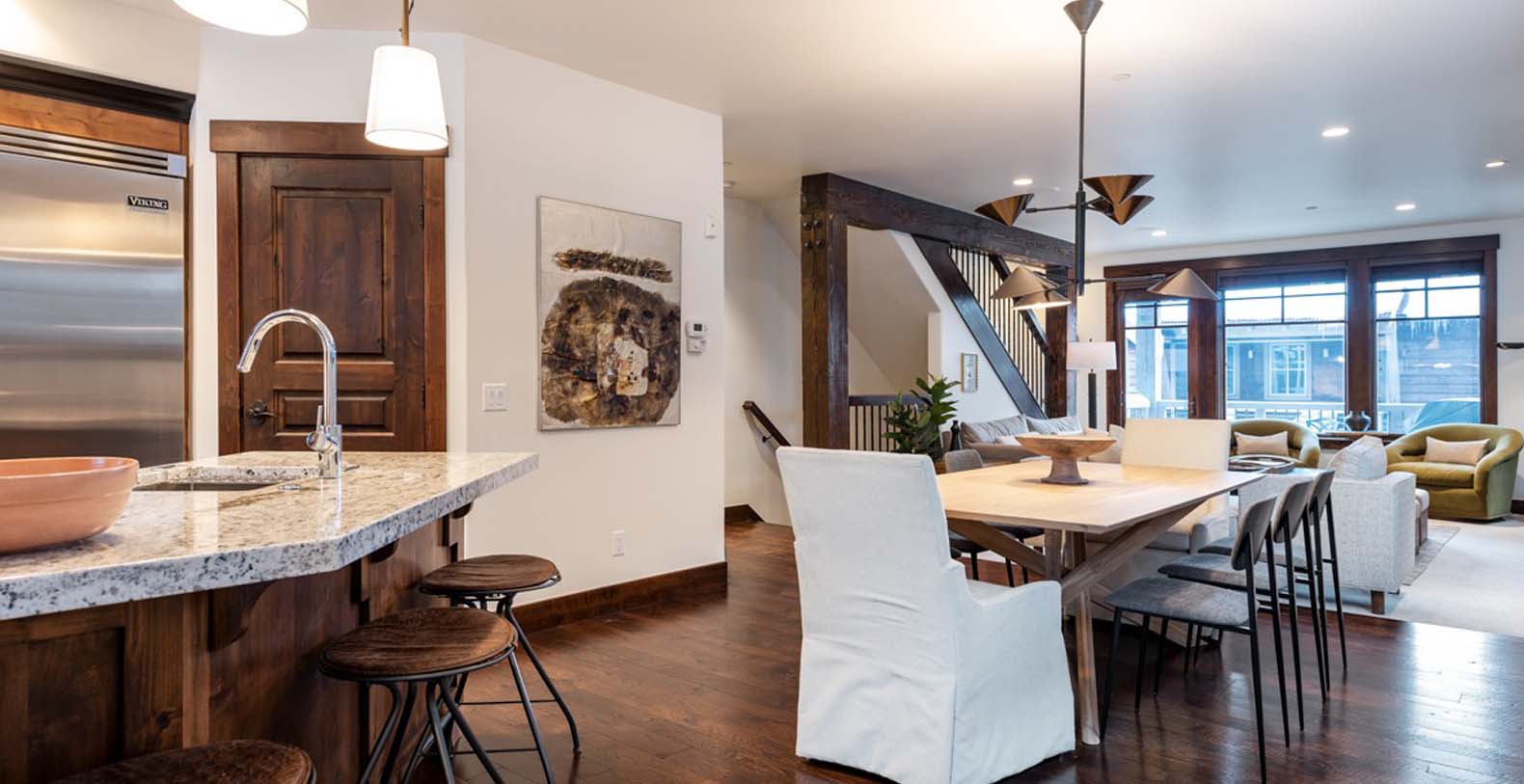 Inside, deep wood tones and warm finishes create a cozy atmosphere. The main level features a spacious open great room where the kitchen, living, and dining areas flow seamlessly. The living space includes ample soft seating with a divan, sofa, two armchairs, and two ottomans—perfect for relaxing or catching up on your favorite shows by the fire. The eight-person dining table provides a formal setting for meals prepared in the chef’s kitchen, which boasts granite counters, high-end Viking appliances, and a breakfast bar seating three. step outside onto the balcony to enjoy a nightcap, with two chairs and a natural gas grill ready for outdoor dining.