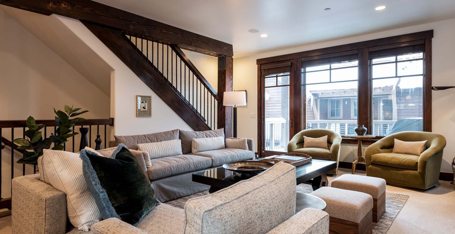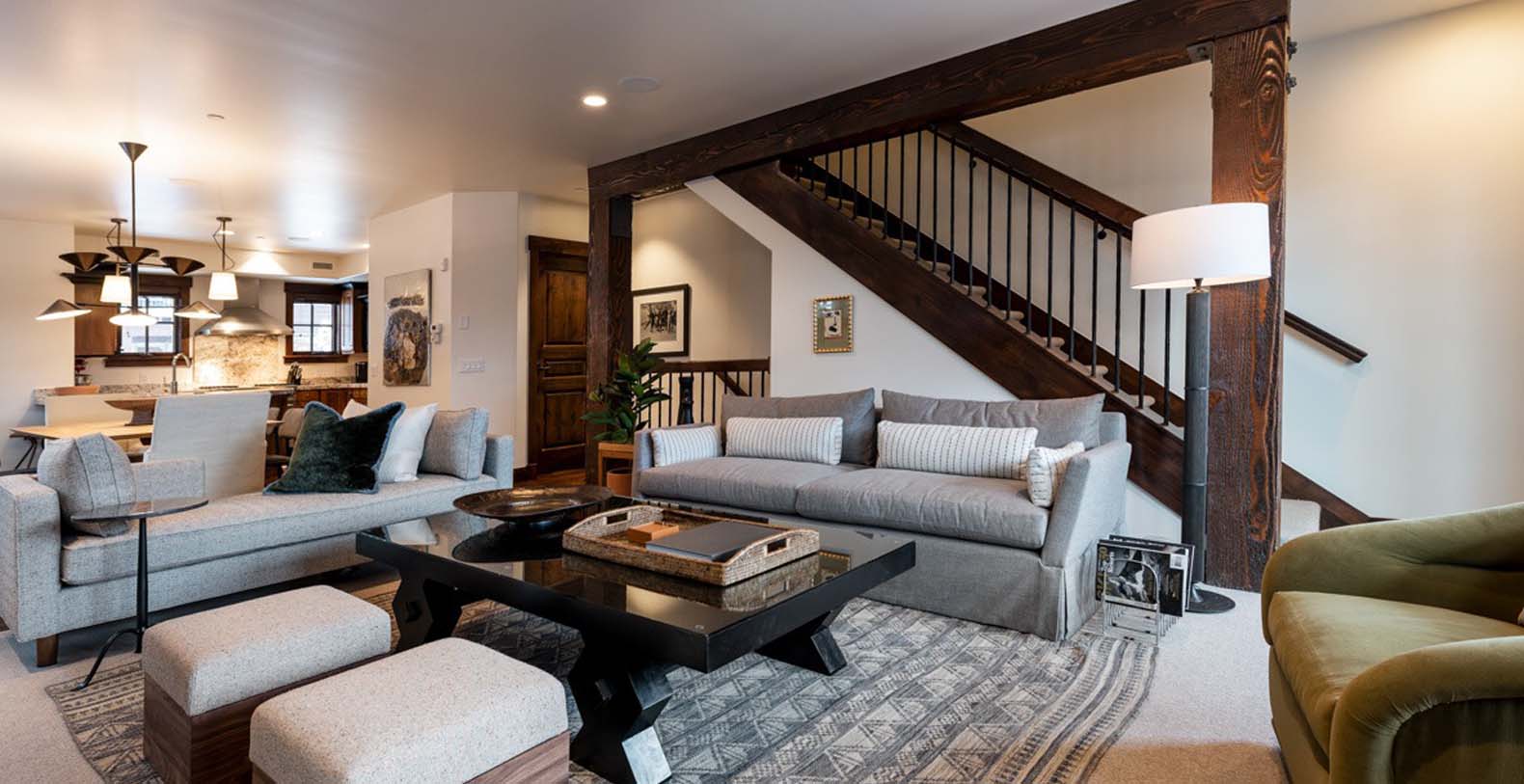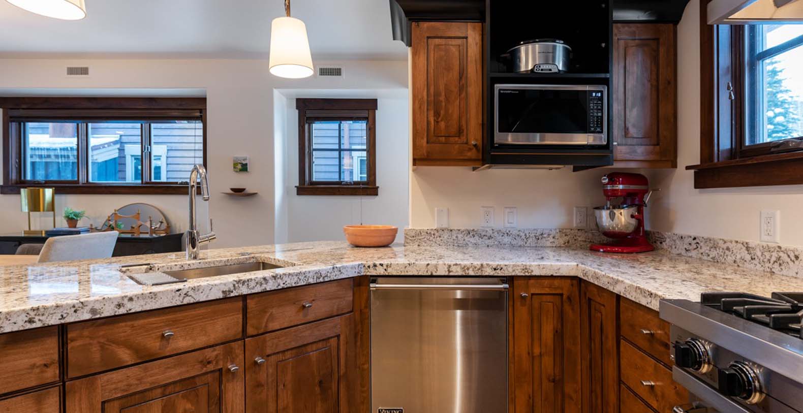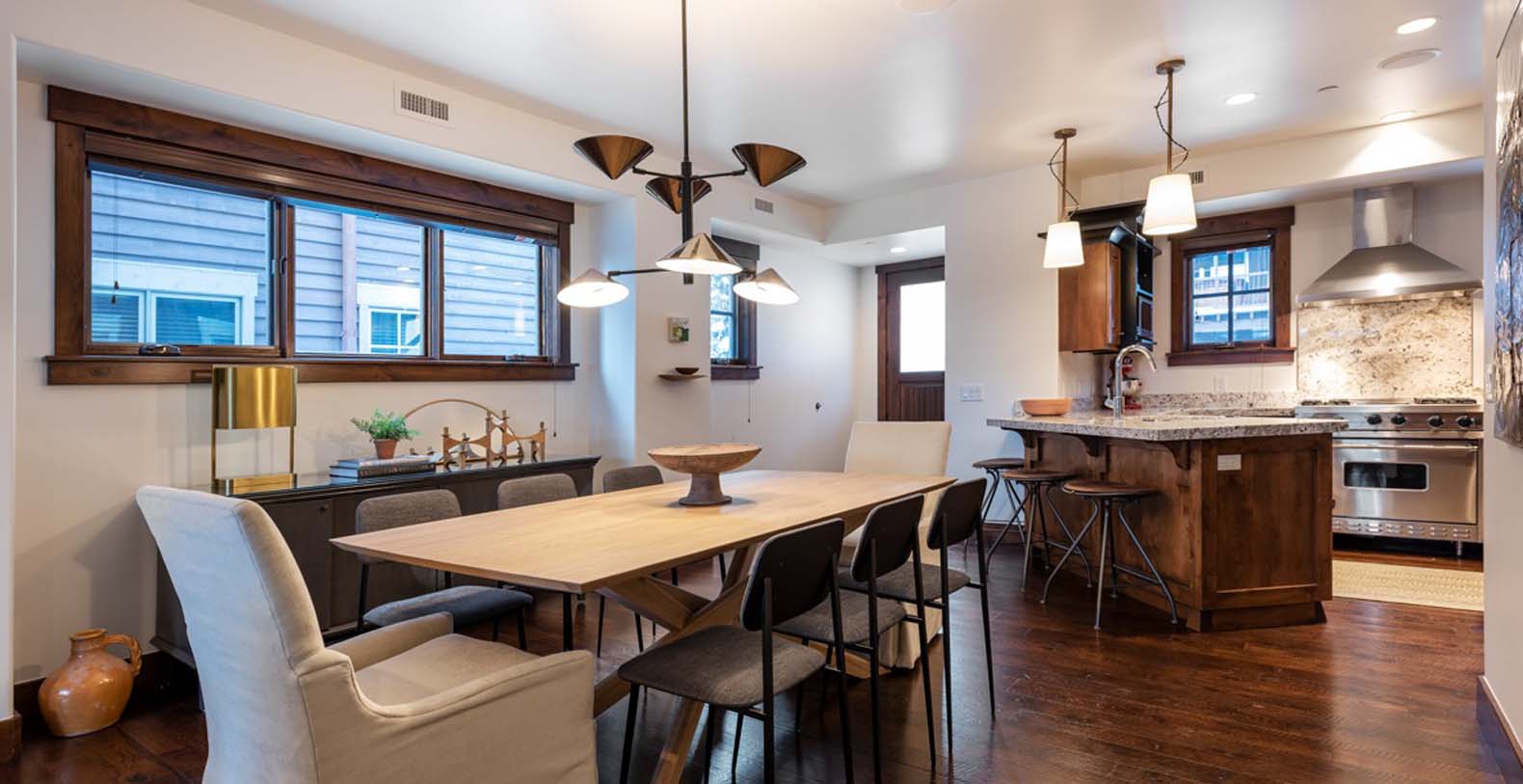 Inside, deep wood tones and warm finishes create a cozy atmosphere. The main level features a spacious open great room where the kitchen, living, and dining areas flow seamlessly. The living space includes ample soft seating with a divan, sofa, two armchairs, and two ottomans—perfect for relaxing or catching up on your favorite shows by the fire. The eight-person dining table provides a formal setting for meals prepared in the chef’s kitchen, which boasts granite counters, high-end Viking appliances, and a breakfast bar seating three. step outside onto the balcony to enjoy a nightcap, with two chairs and a natural gas grill ready for outdoor dining.