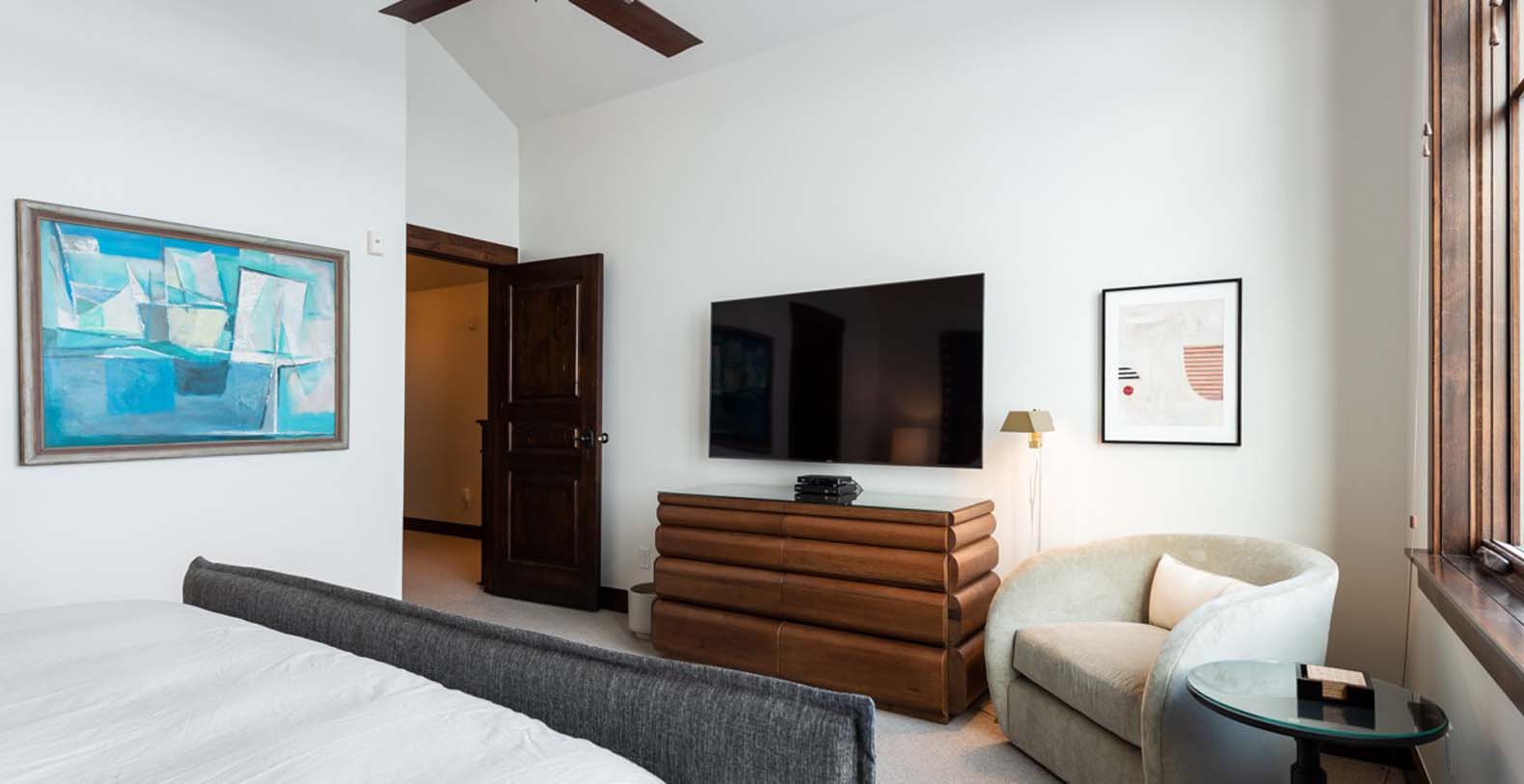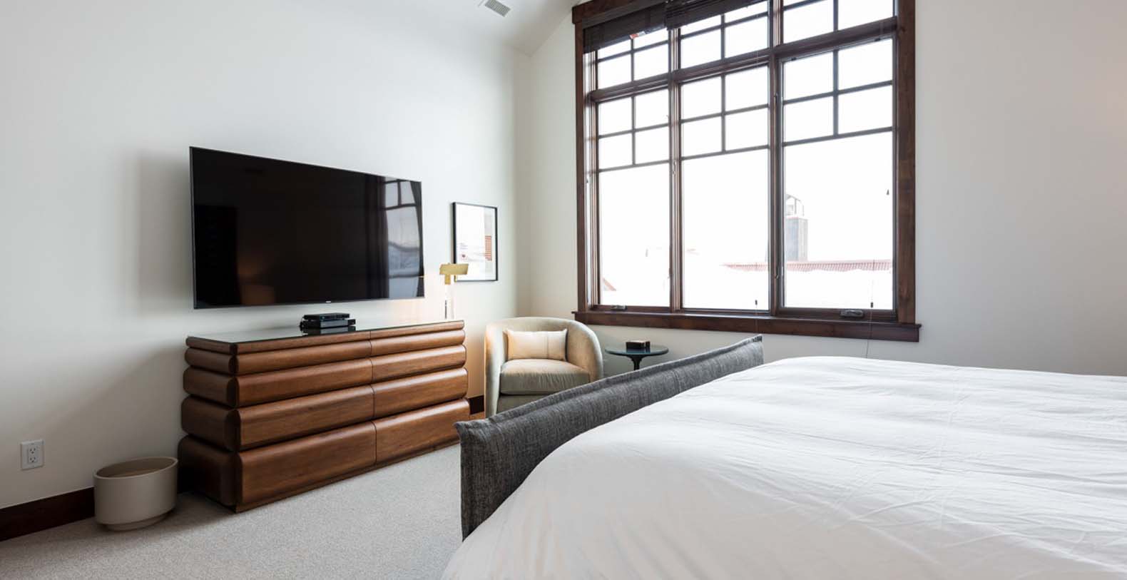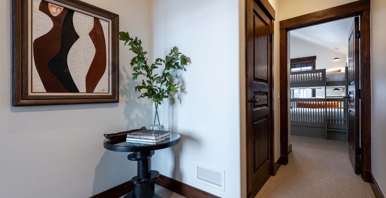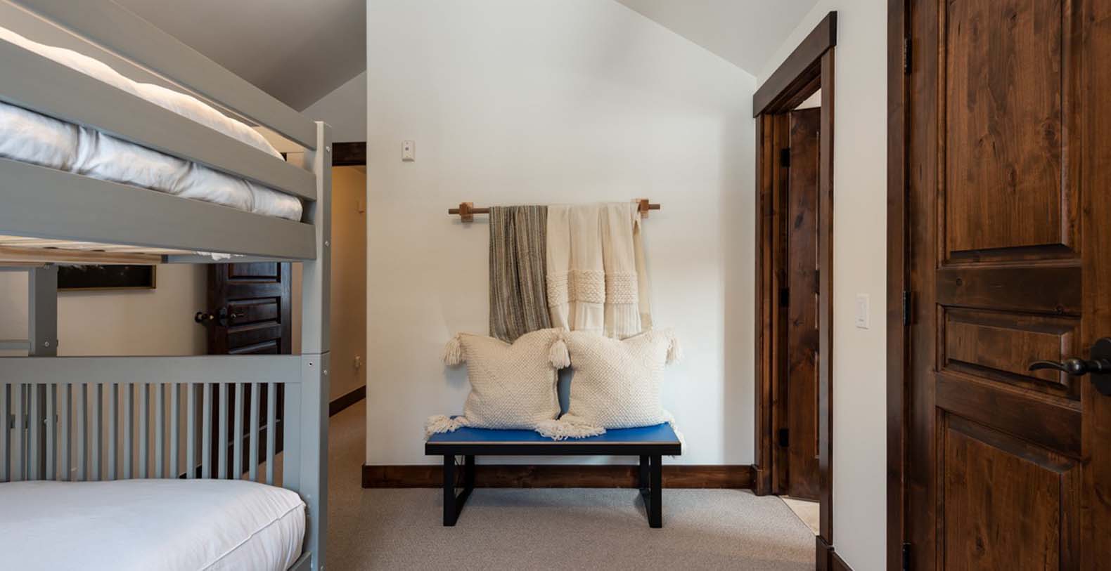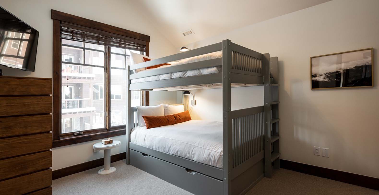 The lower level opens to a patio with a private hot tub, ideal for unwinding after exhilarating days on the mountain. The guest bedroom with a king bed and TV offers a comfortable retreat for restful nights. Upstairs, the light-filled primary bedroom features a plush king bed and a luxurious private bathroom. Down the hall, a bunk room with a queen-over-queen bed and a twin trundle provides additional space for family and friends.