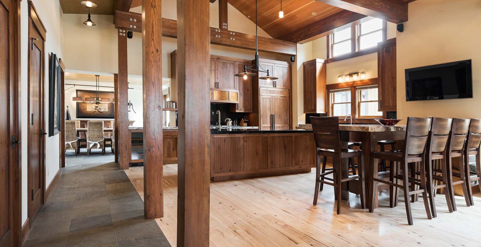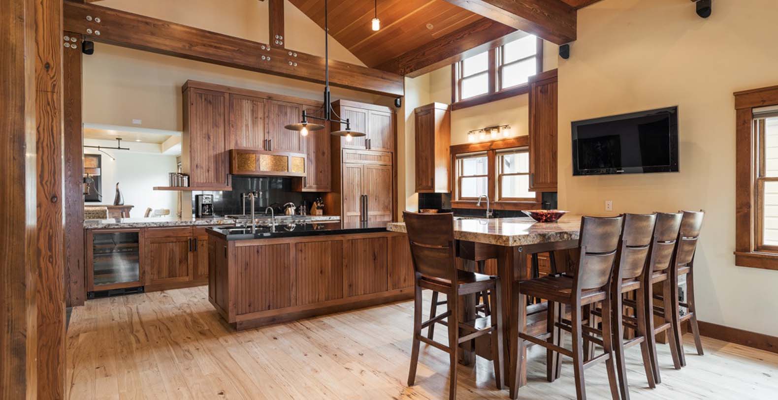The main level sets the stage with hardwood floors, a cathedral ceiling, and exposed rafters, harmoniously blending elements of Park City's mining heritage with contemporary architectural design. The open flow between the kitchen, dining, and living areas fosters connection and camaraderie among family and friends. Gather in the living area by the impressive stone fireplace or settle in for movie night on the 55” TV. The well-equipped chef’s kitchen features ample counter space and high-end appliances, including a wine cooler and a Wolf 6-burner gas range. Enjoy après-ski drinks at the stylish bar-height table for 8 and relish lively dinners at the elegant dining table that seats 8. Step out onto the attached balcony with a grill to savor the crisp alpine air.