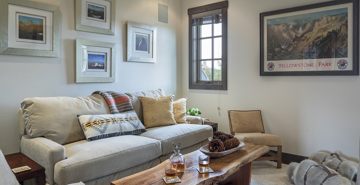 Back inside, the master bedroom pairs privacy with style: A plush king size bed, antique desk and abundant natural light. A pair of slipcovered armchairs makes for a cozy fireside moment while a flat-screen TV above the mantel creates connection with the outside world. The ensuite bath offers a Jacuzzi tub, glass shower, granite double vanity and panoramic views. The nearby media room invites lounging with its deep sofa, studded side chairs and live edge walnut coffee table. Antique park memorabilia decorates the walls.