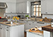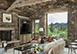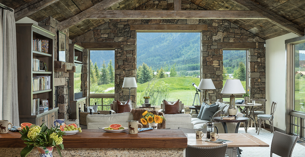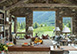 The panorama takes center stage in the great room, an open-concept living and dining space encircled in picture windows. With the Tetons descending to greet the valley floor, every seating ensemble within the great room grants access to breathtaking scenery. Thus oriented toward scenic enjoyment, the living area hides entertainment options in subtlety; the flat-screen TV seems incognito in the built-in armoire and a rustic game table blends into the stone accent wall. Studded armchairs with leather pillows flank a pair of trimmed tweed sofas, and an antler candelabra accents the hammered metal coffee table. Beyond the slab slate bench beneath the fireplace, a woven armchair offers further fireside seating. An elegant bison print graces the mantel. The adjoining dining area centers around a farmhouse table surrounded by woven chairs. Overlooking the living expanse, the gourmet kitchen offers granite countertops, a Wolf stove and clapboard cabinetry.