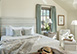 The second bedroom, with the aforementioned French print, is anchored around the queen bed wrapped in plush linens. The neighboring bedroom distinguishes itself with a damask headboard, studded nightstands and cerulean lamps. The ensuite bath comes with a double vanity and ample storage. The junior suite features a textile headboard backing its king bed, seafoam drapes, studded leather bench and armchair plus ottoman. The ensuite bath offers a soaking tub, shower and granite vanity.
