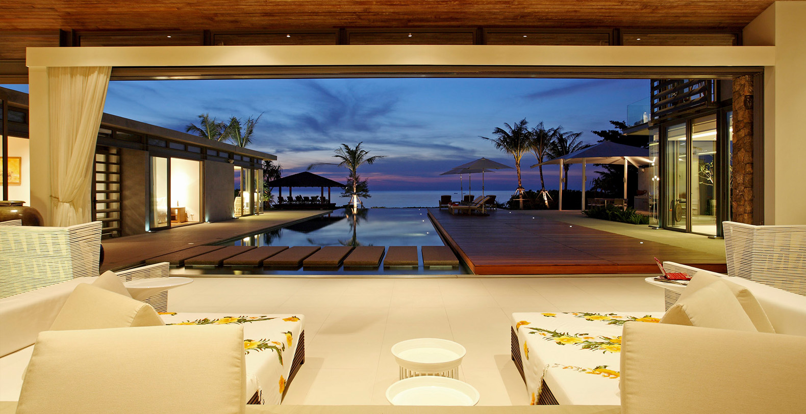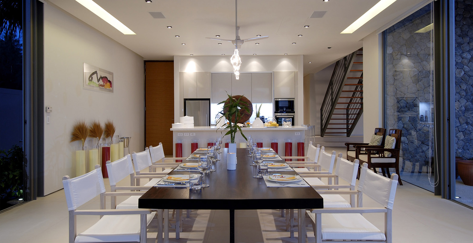 Arranged in a U-shape that wraps around a central pool, Malee Sai offers wide sea views. Set at the villa’s centre, just behind the 25-metre pool, the open-plan living area features floor-to-ceiling glass doors that slide open fully to let the ocean breezes flow through. Access to all areas of the villa, both indoors and out, is via this pivotal space. The TV room off to the side leads to the villa’s single-storey wing with three bedrooms including a master suite that extends along the pool’s length towards the sea. The dining area and guest kitchen are on the ground floor of the two-floor wing opposite, with a second master suite and two guest bedrooms above.